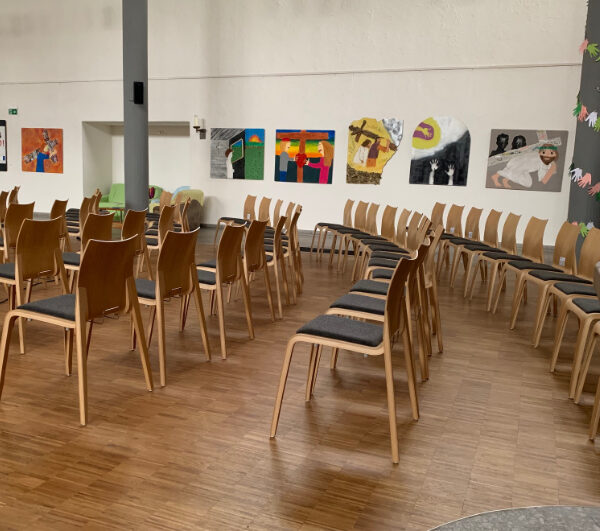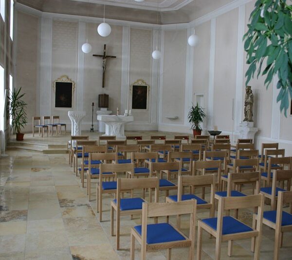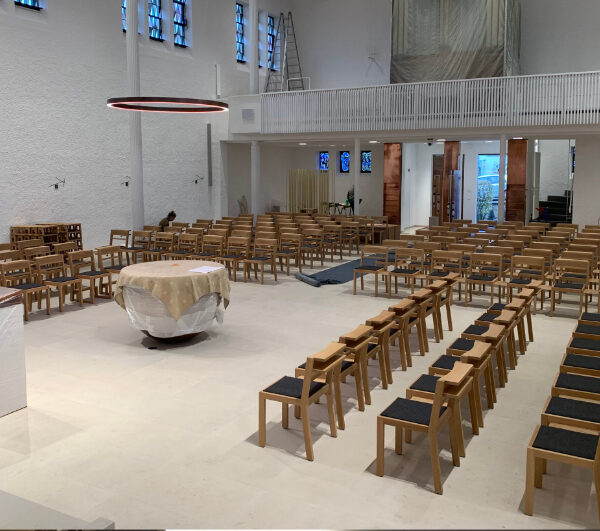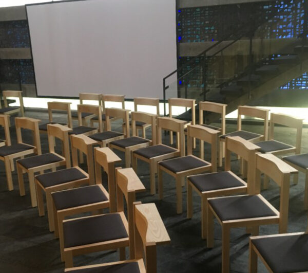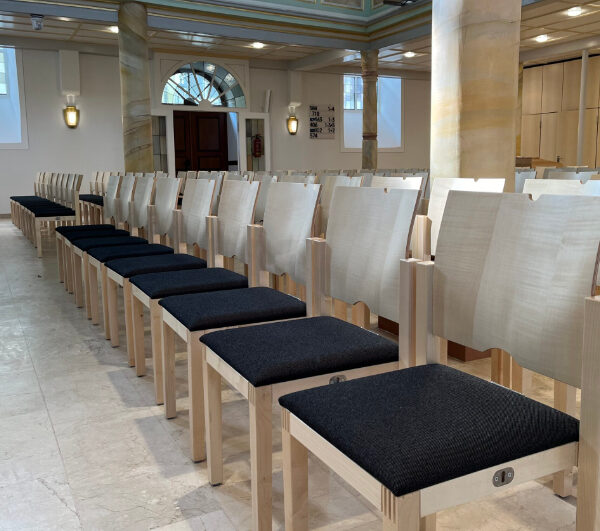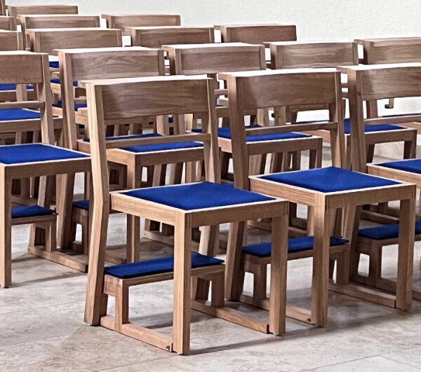 Unsere Kirchenstühle SEPTEM, OCTO und NOVEM mit hochklappbarem Kniebrett sind geeignet für die Bestuhlung von Kirchen und Kapellen. Die Massivholz-Rückenlehne ist mit einem Armbrett und mit einer Buchablage ausgeführt. Die Stützen des Kniebretts werden beim Hochklappen eingezogen. Das Kniebrett ist mit einem unsichtbar eingebauten Gewichtsausgleich ausgestattet, der das Betätigen des Kniebretts erleichtert und das ungewollte Herabfallen verhindert. Das Kniebrett ist auch gepolstert lieferbar. Die Modelle sind ohne Kniebrett und auch als Reihenstühle erhältlich. Sitzflächen wahlweise gepolstert, oder als Geflecht. Huthaken, Reihenverbindungen und Frontelemente für die erste Reihe sind ebenfalls lieferbar. Ausführung in den unterschiedlichsten Holzarten.