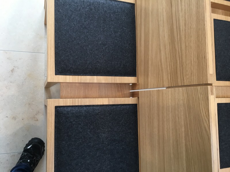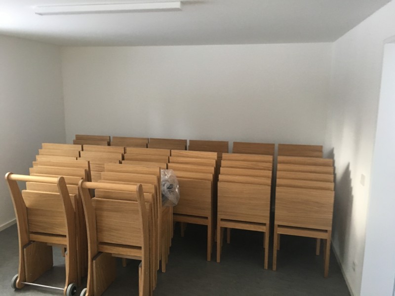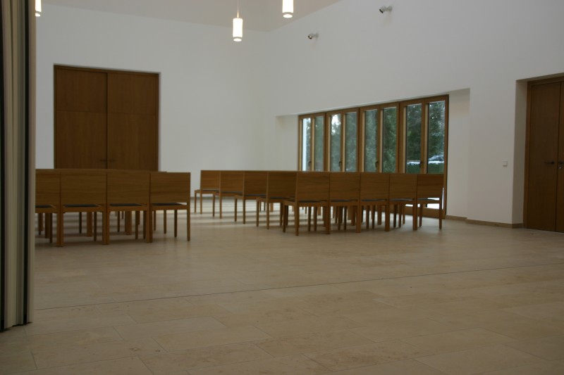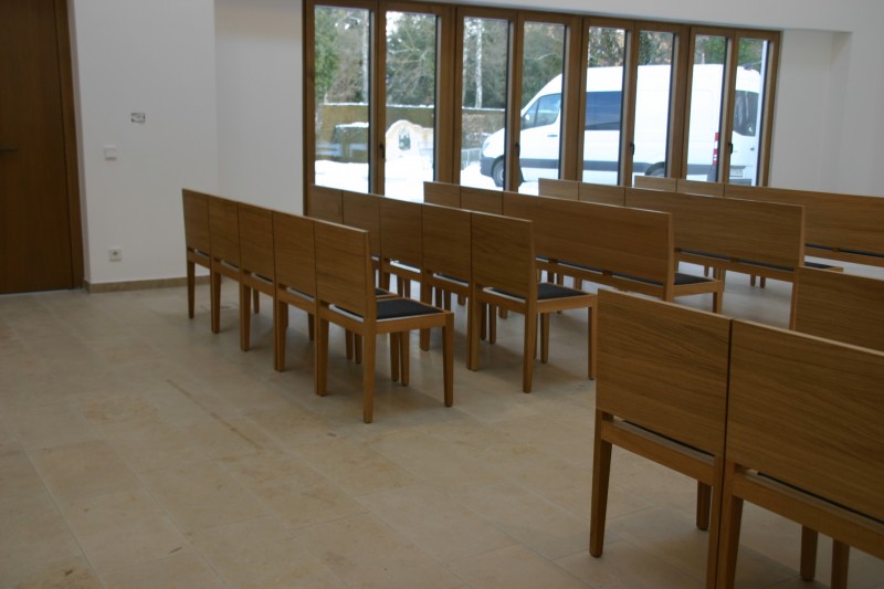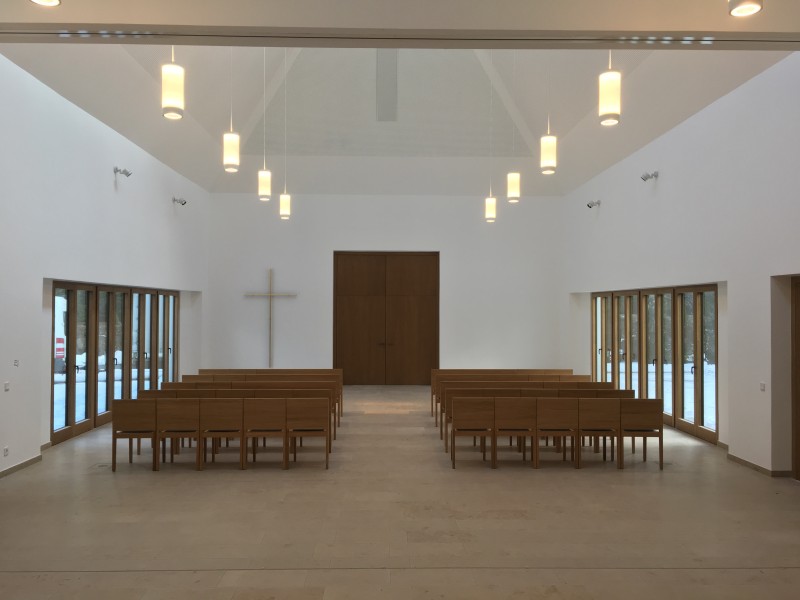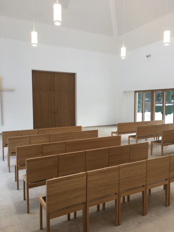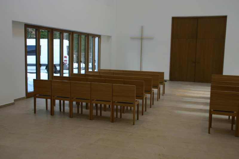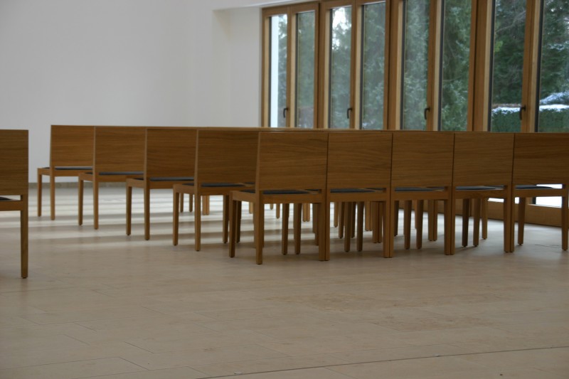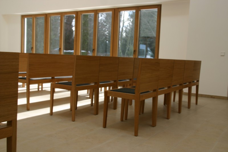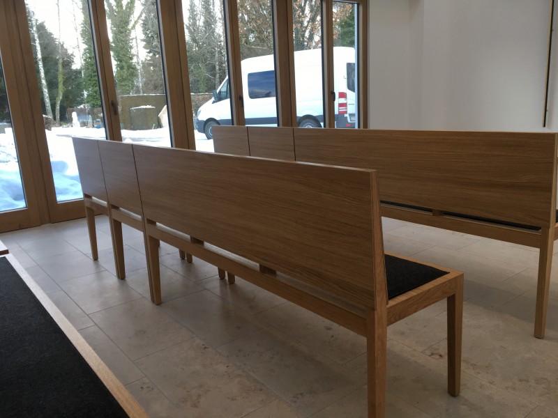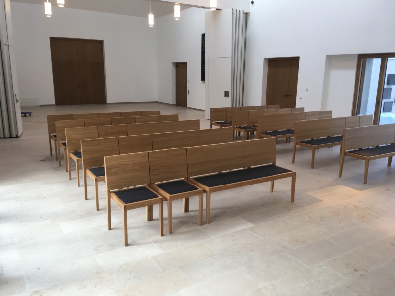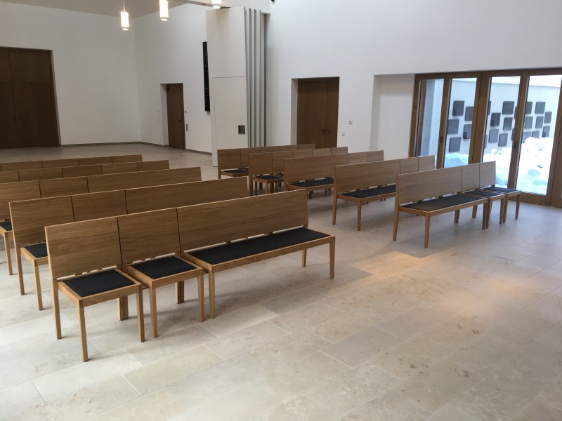 Für die Aussegnungshalle Pullach i. Isartal (bei München) haben wir nach Entwurf der Münchener Architekten Bahner+Holzfurtner Stühle in Eiche gefertigt. Die Rückenlehne besteht aus einem Eichensperrholz, bei dem auch die Mittellagen aus Eiche-Furnier bestehen. Das Sitzkissen ist mit beidseitigem Wollfilz und Schaumstoffeinlage gefertigt. Die Reihenverbindung ist unter den Stuhl klappbar. Für die ersten Reihen wurden zusätzlich Bänke für 3 Personen hergestellt. Die Abbildungen zeigen die Grundbestuhlung mit ca. 42 Sitzplätzen, welche auf 120 Sitzplätze erweitert werden kann.