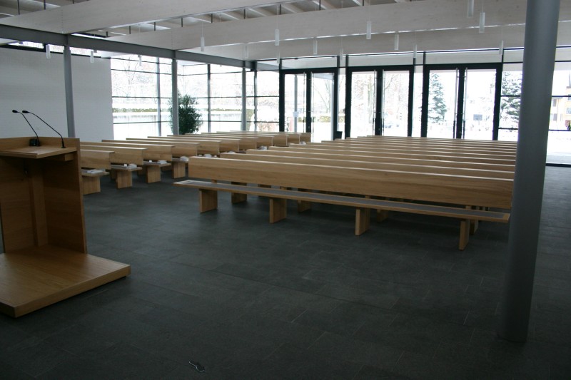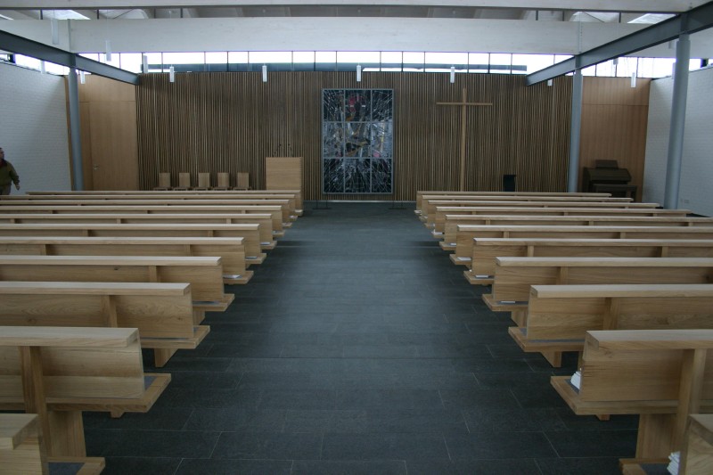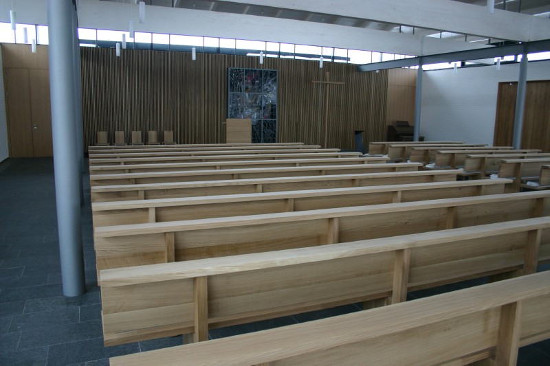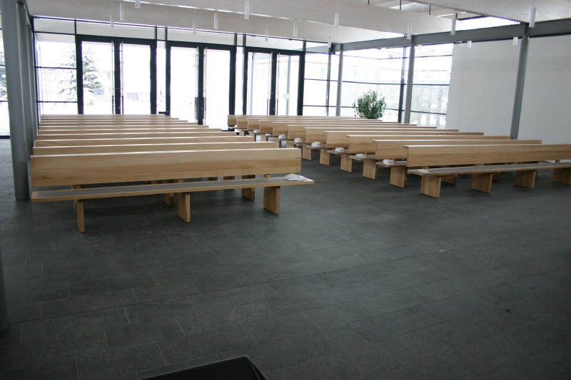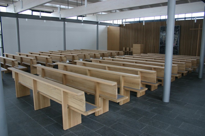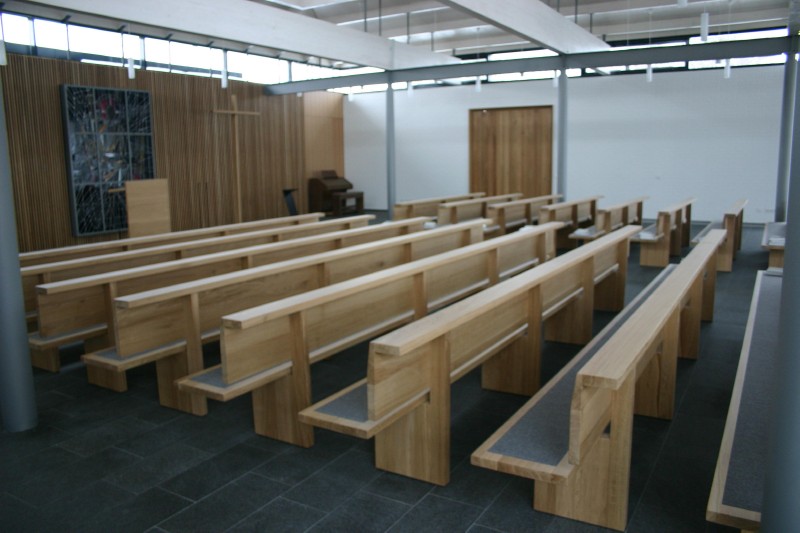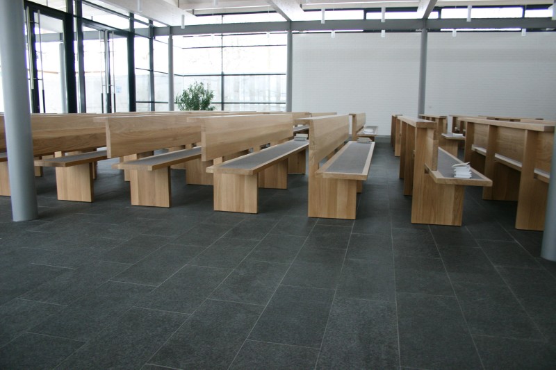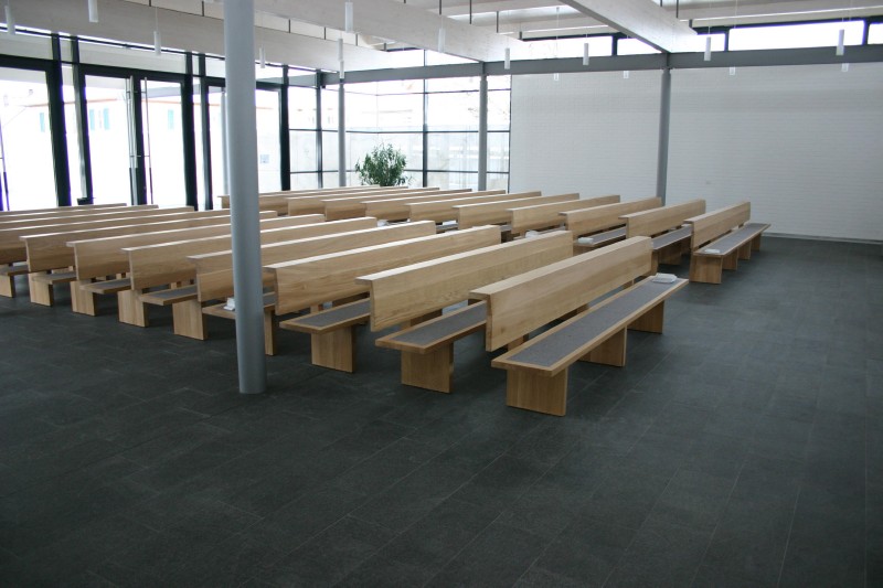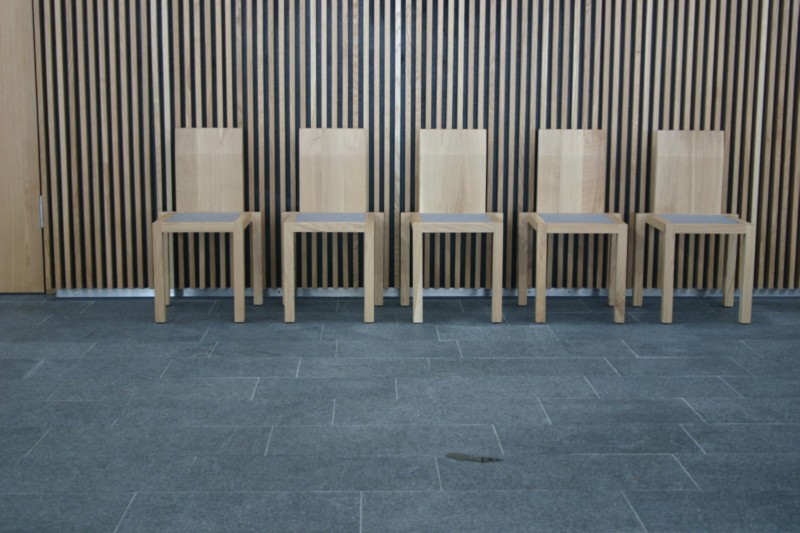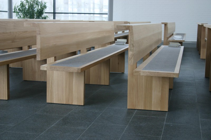 Sitzbänke in Eiche massiv, Sitz mit eingelegtem Merinofilz.