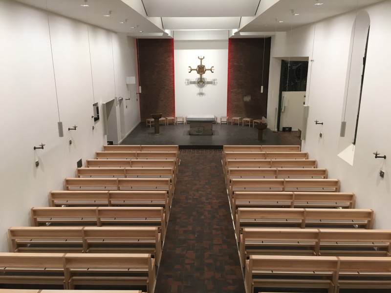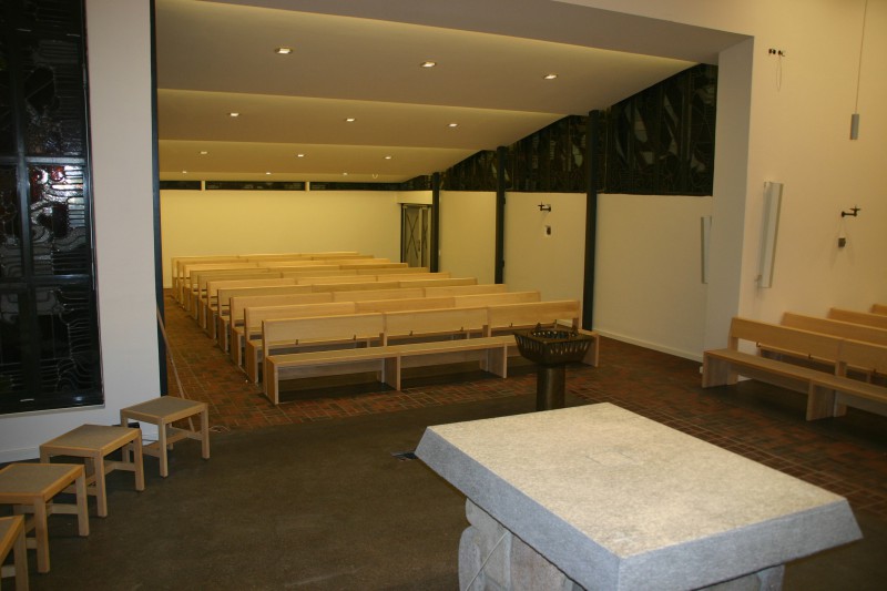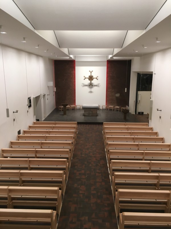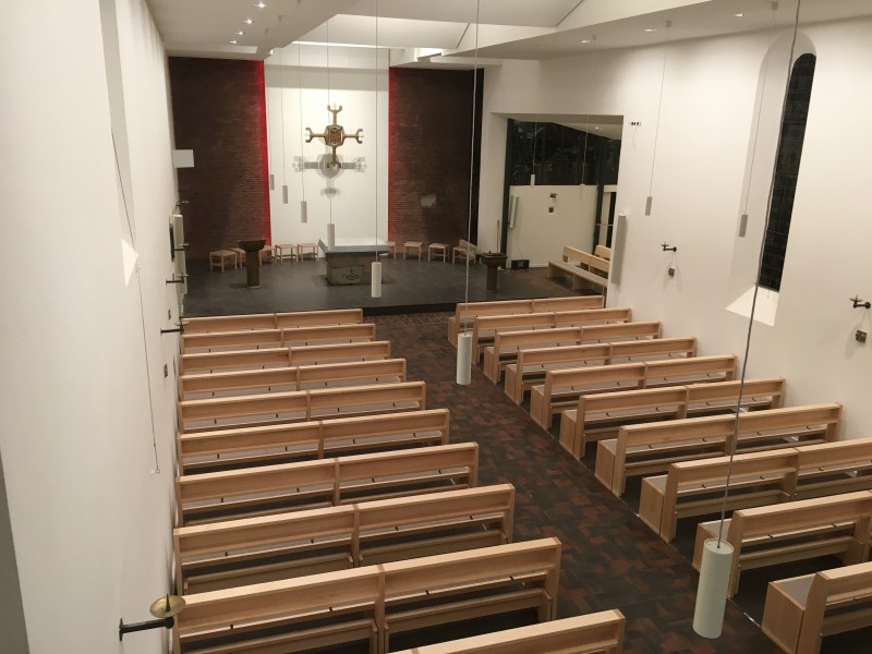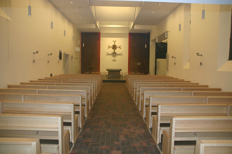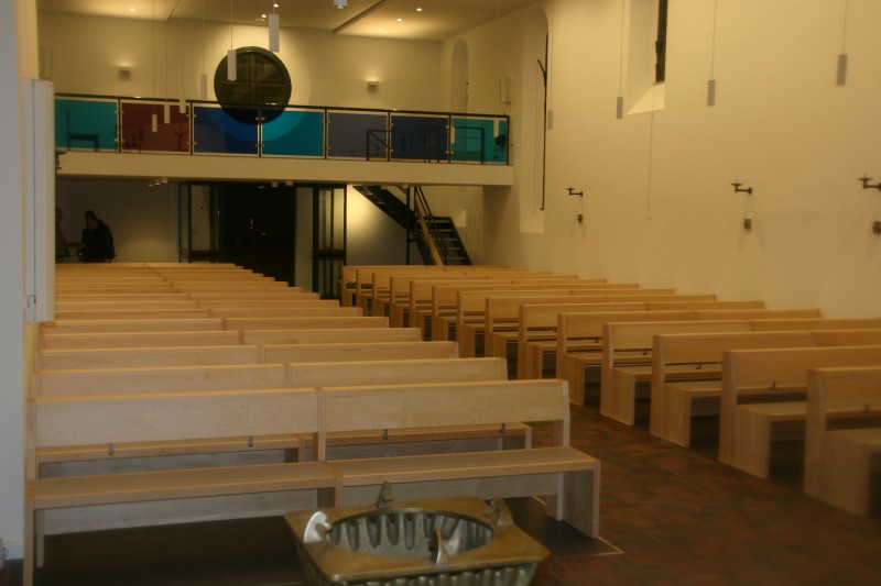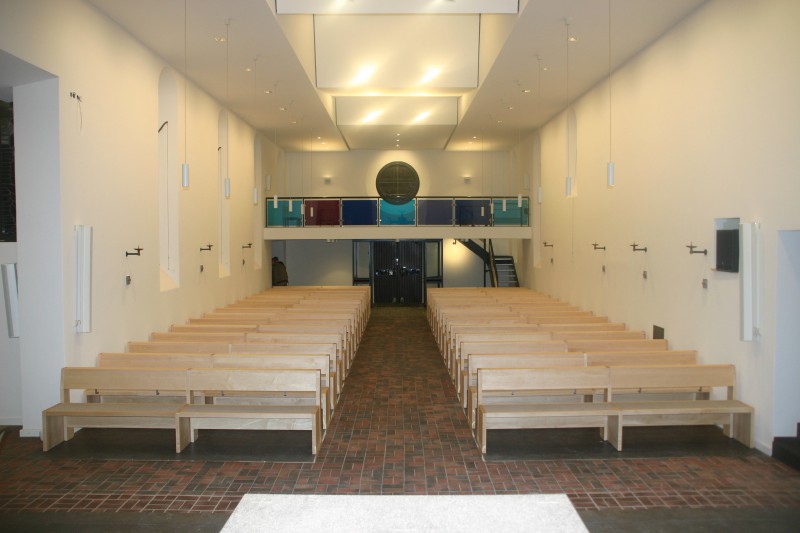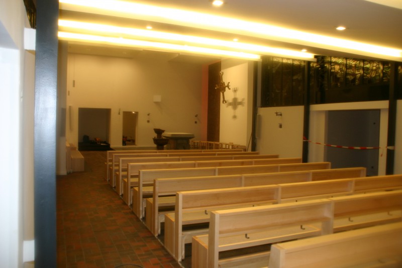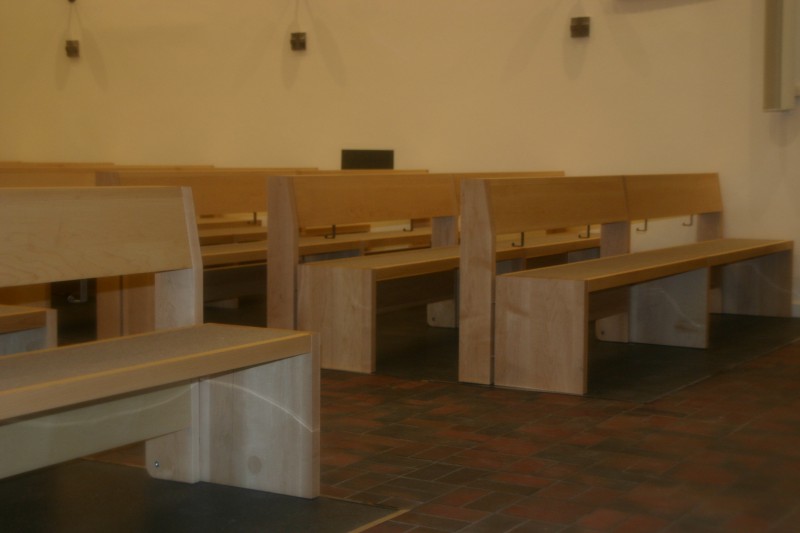 Für die Kath. Kirche in Buchholz bei Hamburg haben wir neue Bänke in Ahorn angefertigt. Die Sitzflächen sind in einem flächenbündig eingelassenen Merinowollfilz ausgeführt. Die Kniebänke sind klappbar. Passende Stühle und Sedilien haben wir ebenefalls geliefert.