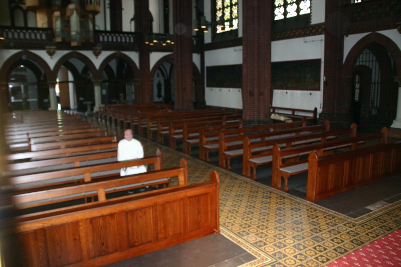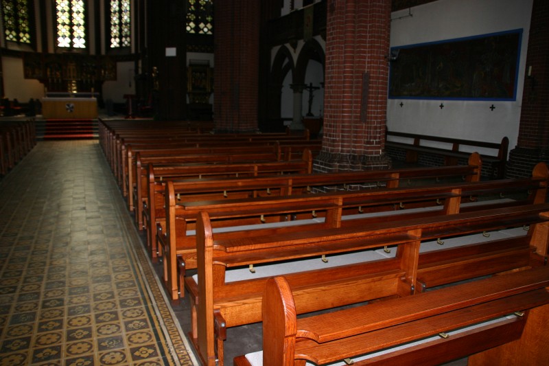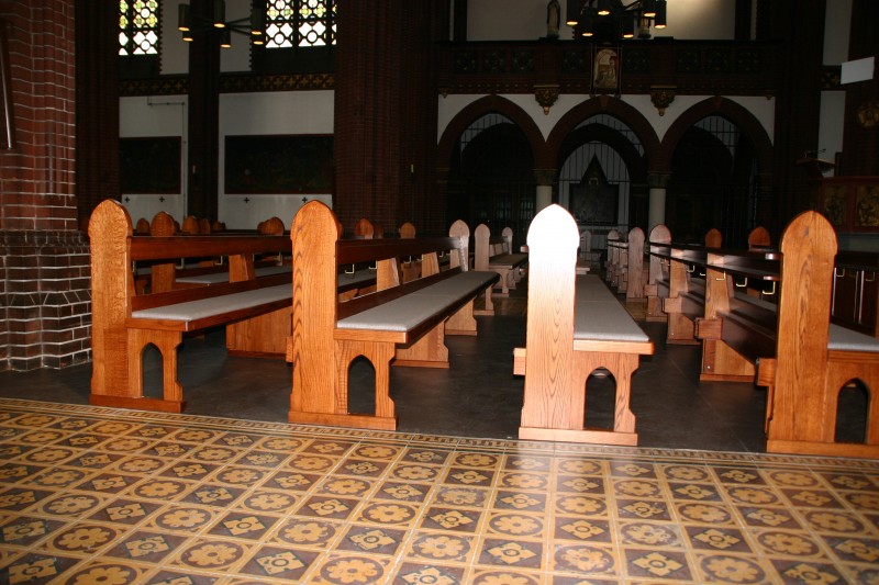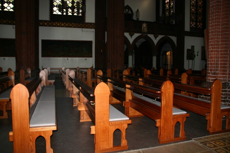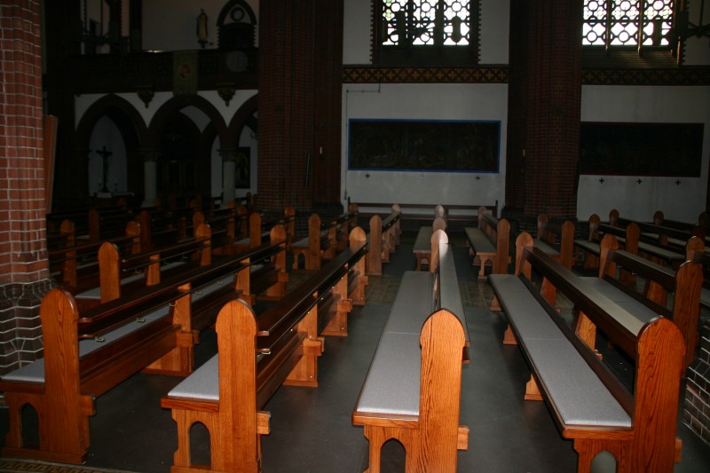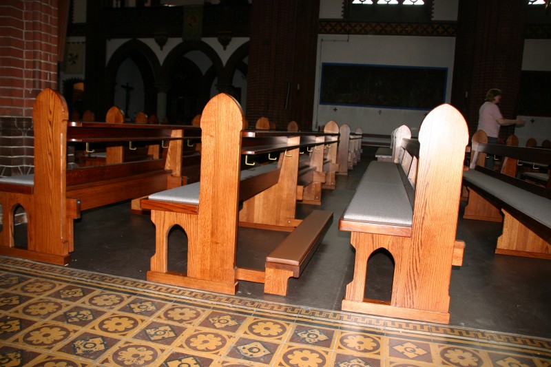 Kirchenbänke in Eiche Massivholz, gebeizt, Sitzfläche mit integrierter Polsterung, Kniebänke klappbar und gepolstert.