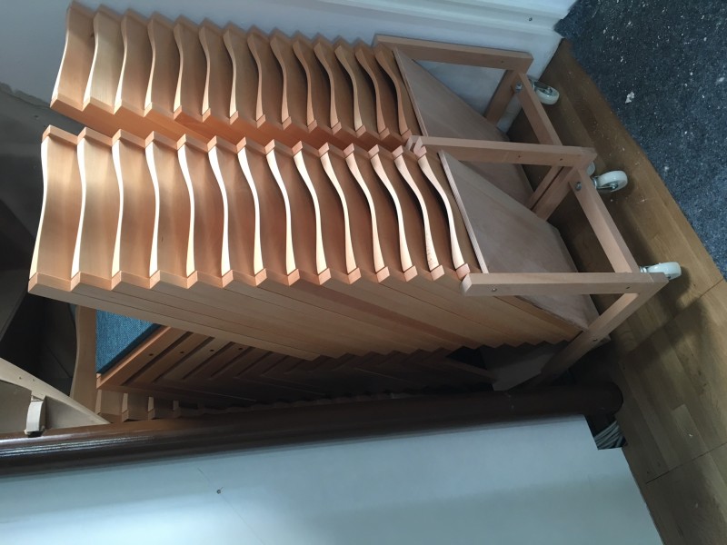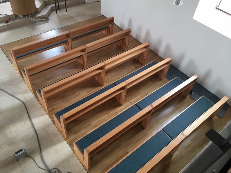 Für die evangelische Kirchengemeinde in Dobel im Nordschwarzwald fertigten wir Bänke und Stühle in leicht geämpfter Buche. Die Sitzauflagen der Bänke sind beheizbar.