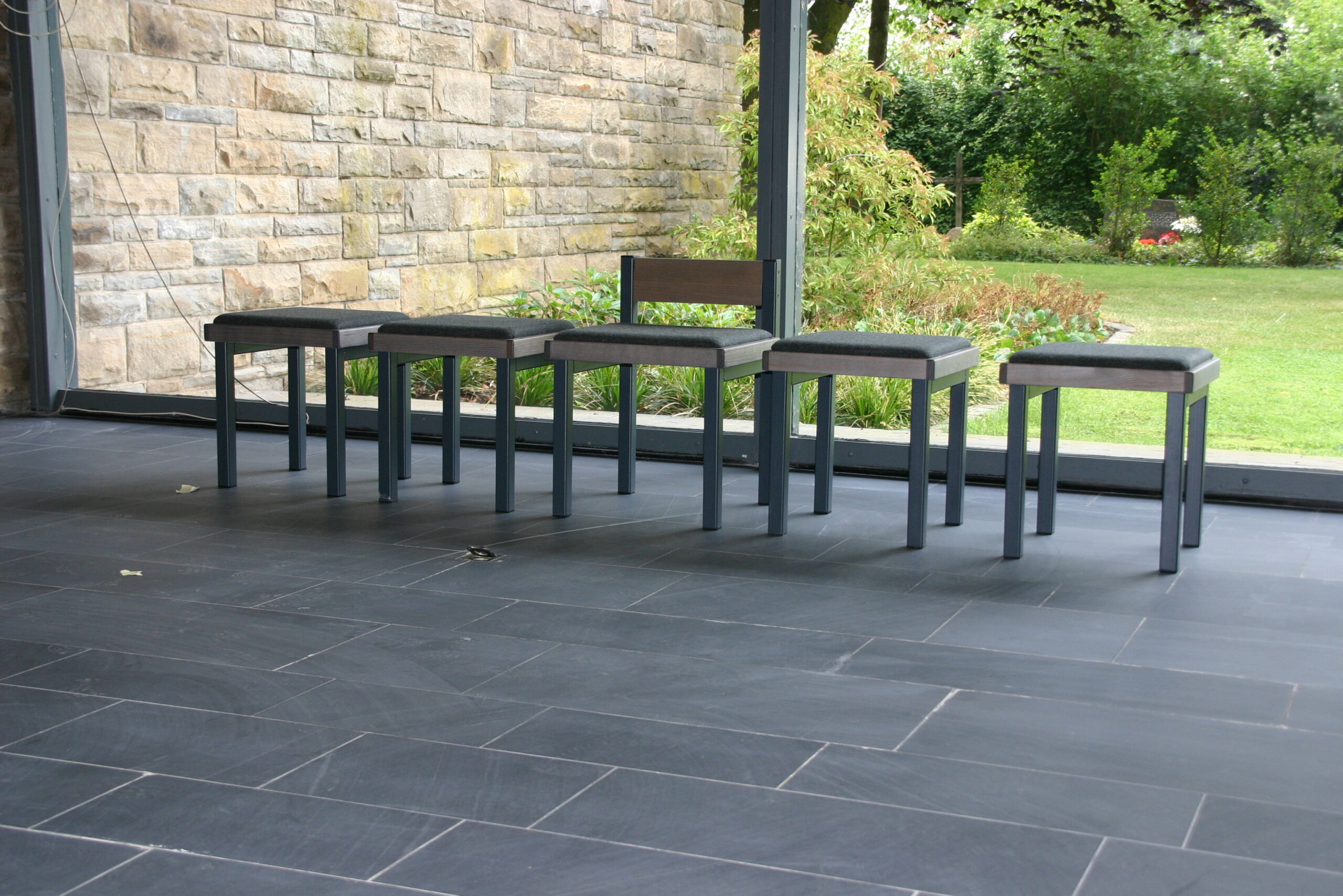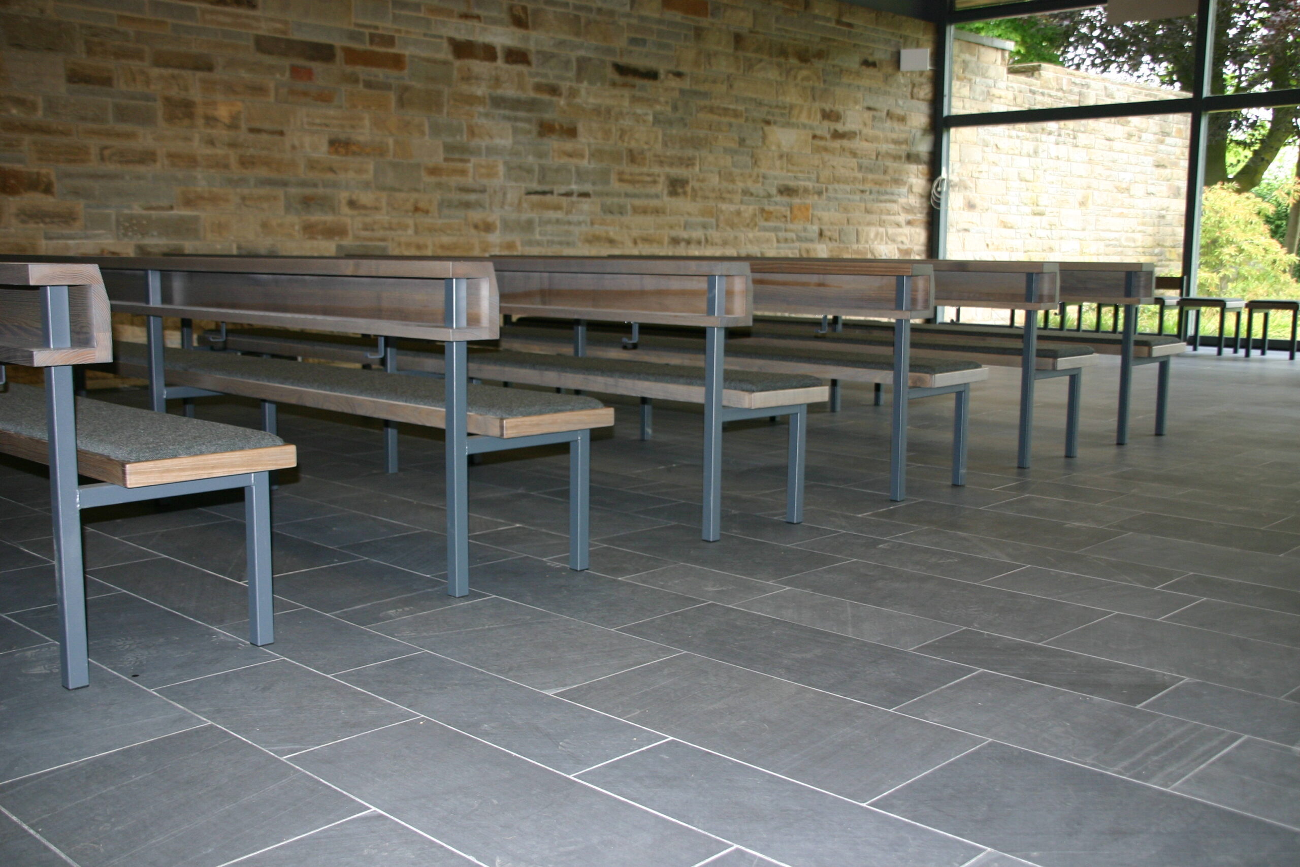 Sitzbänke in Esche, dunkel gebeizt, Sitzfläche mit integrierter Polsterung, Gestelle aus Vierkantrohr.