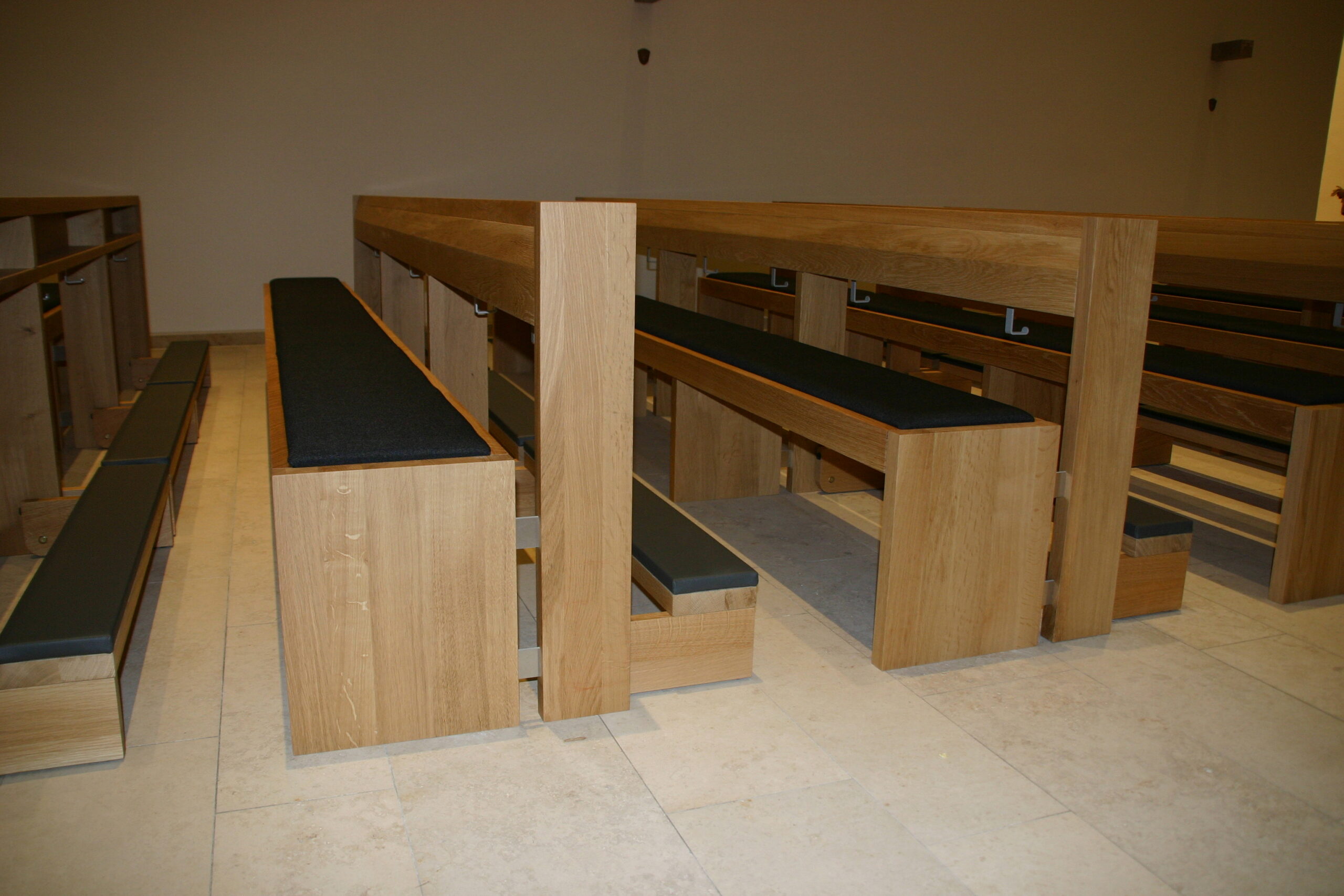 Kirchenbänke in Eiche, Sitz mit integrierter Polsterung, Kniebrett klappbar und gepolstert.