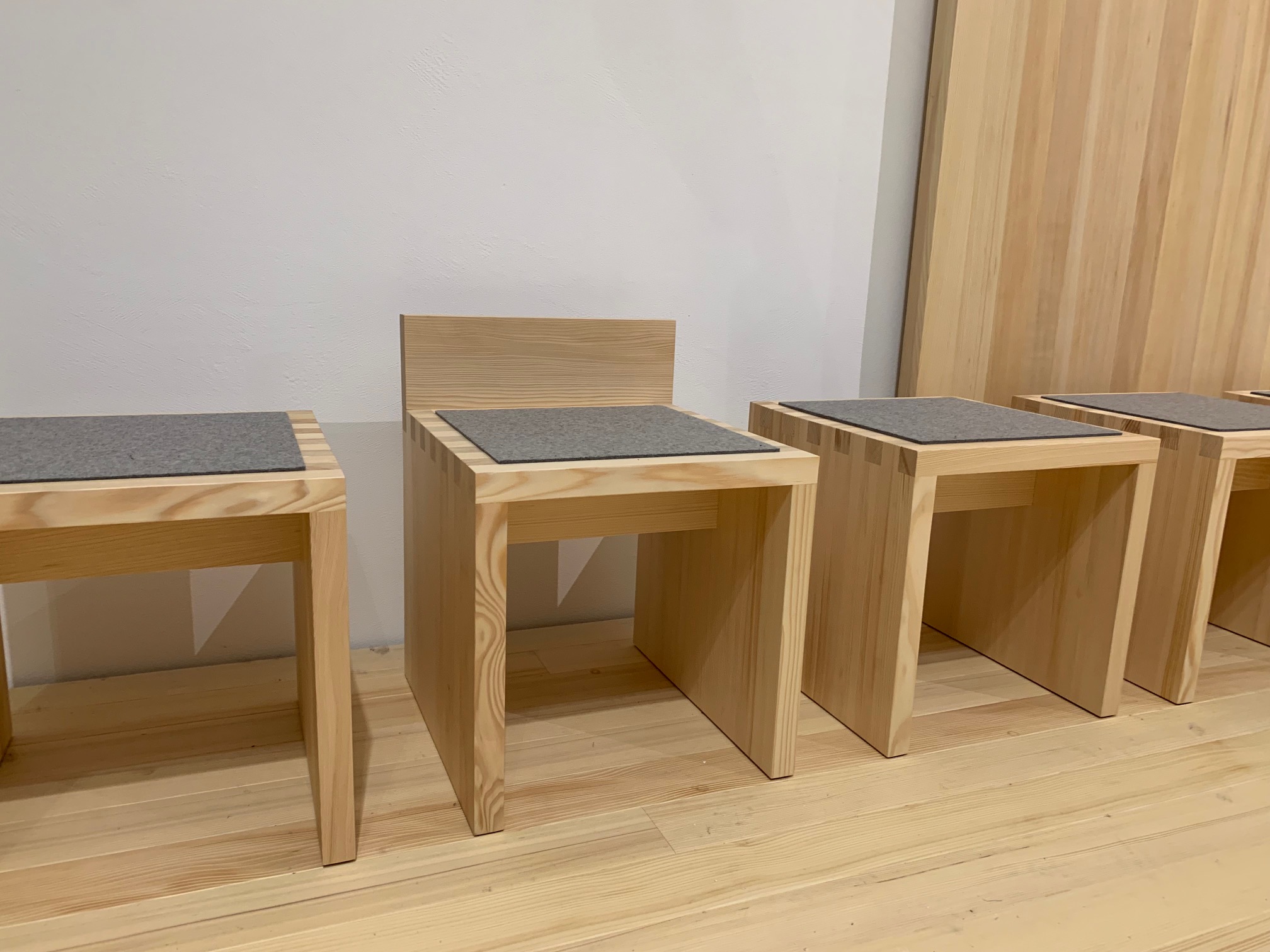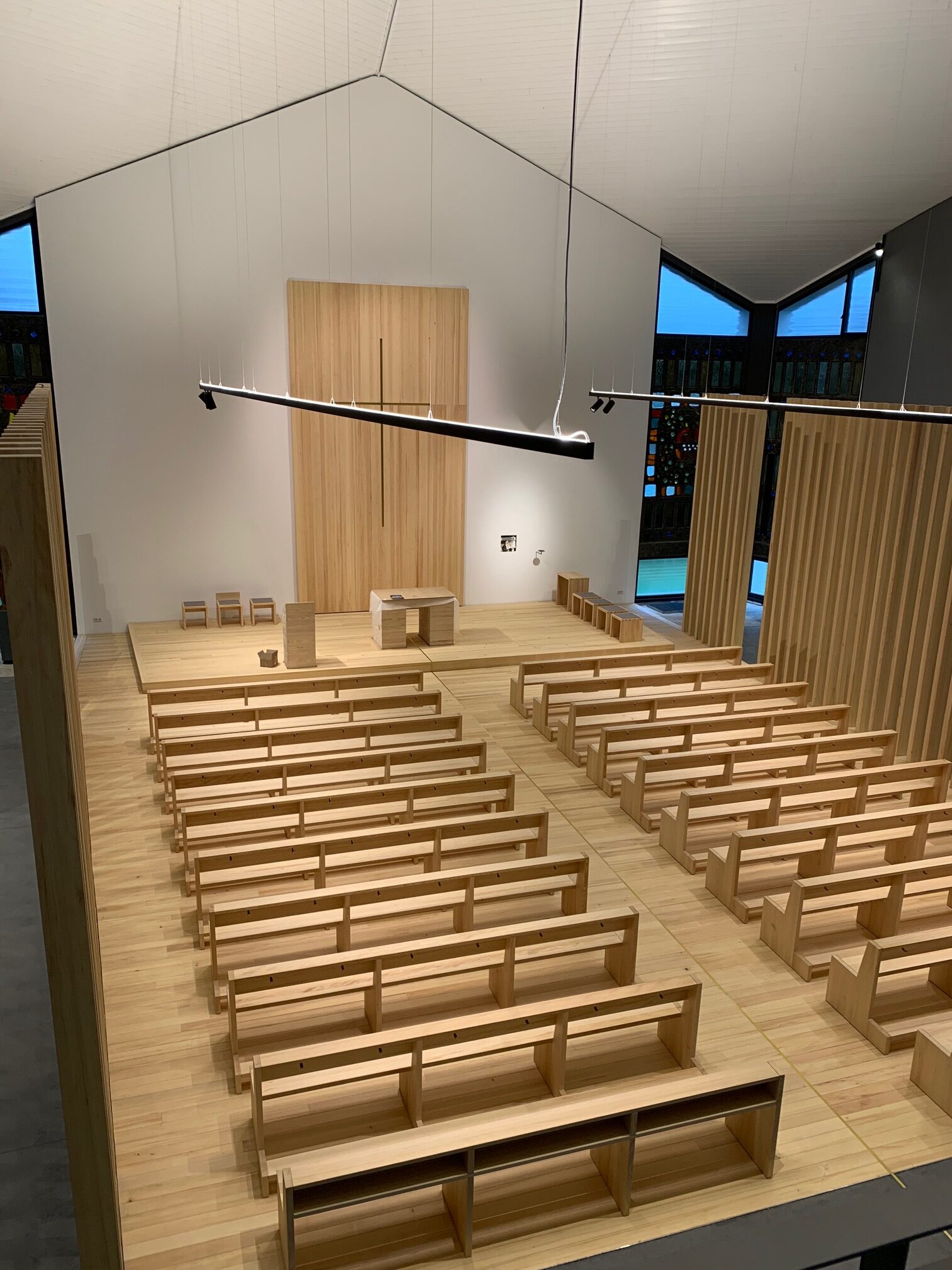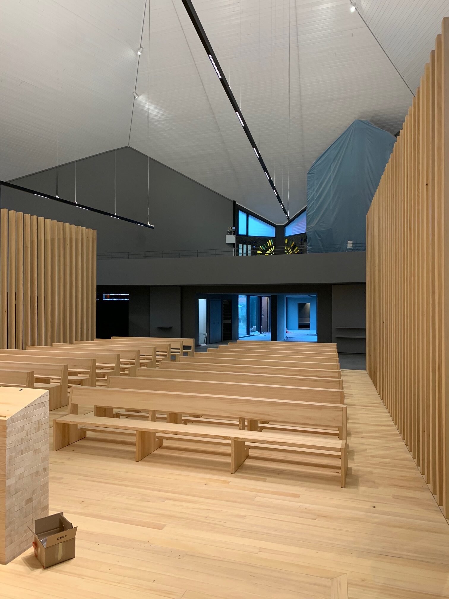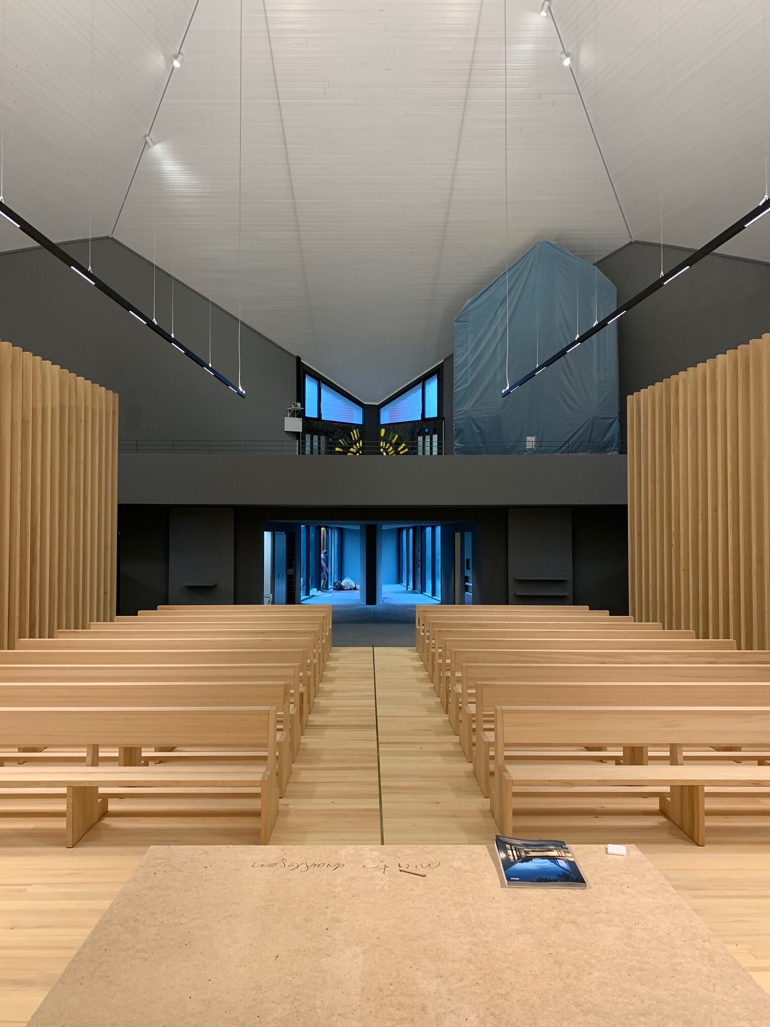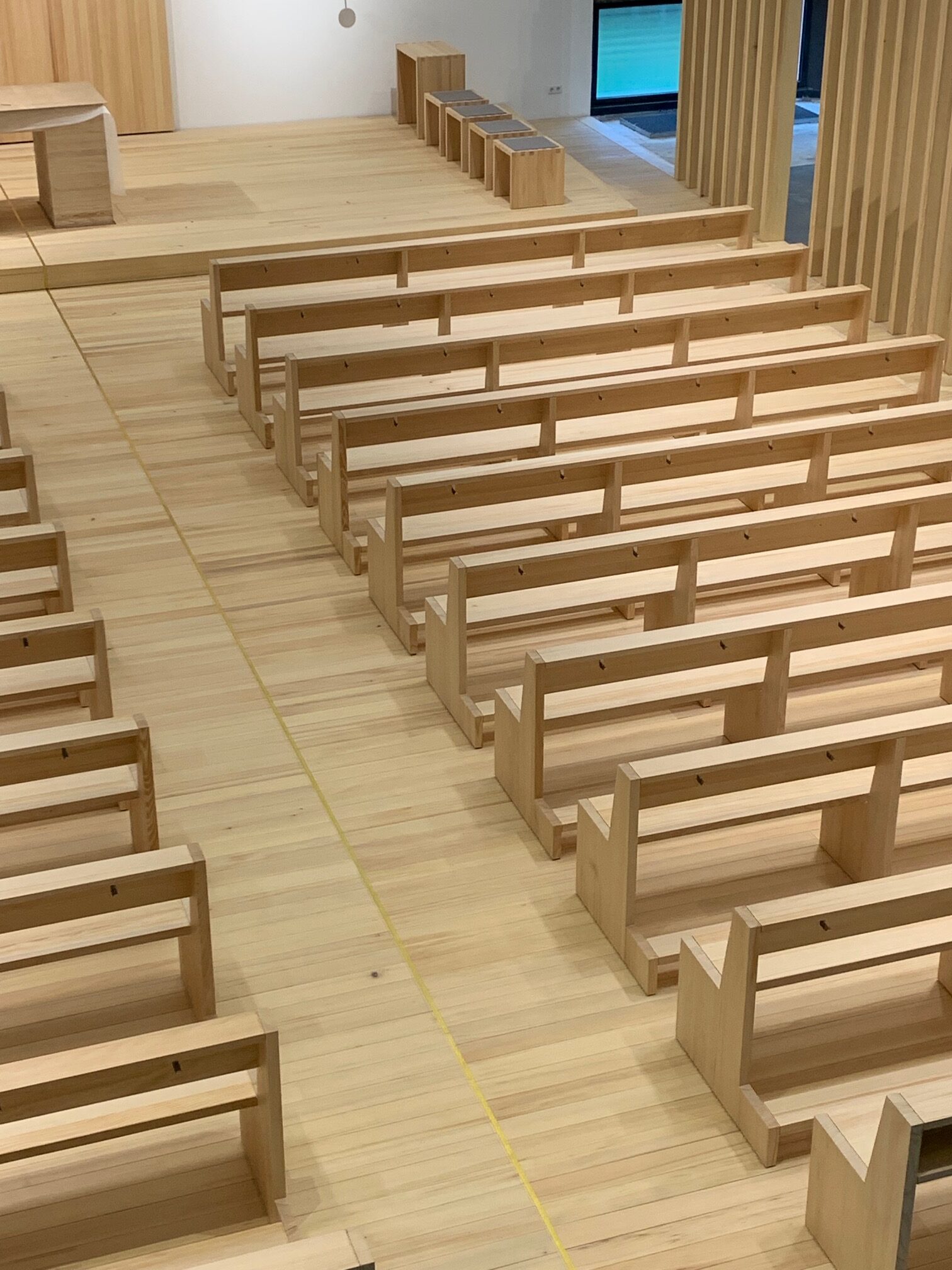 Bänke in Weißtanne. Umbau der Kirche zur Kolumbariumskirche.