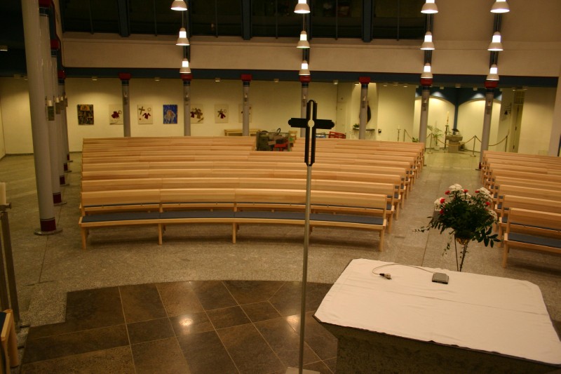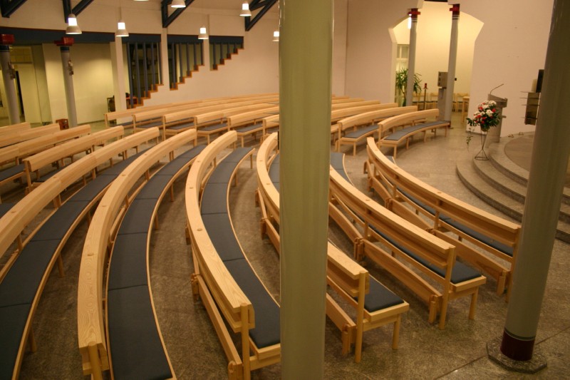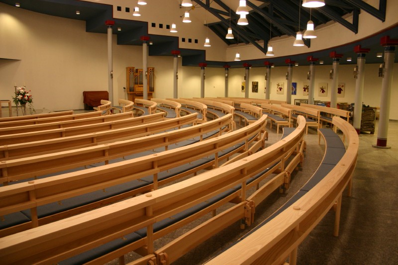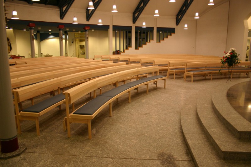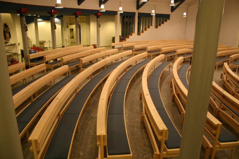 Kirchenbänke in Esche, Sitzfläche mit integrierter Polsterung. Kniebrett klappbar mit Gewichtsausgleich und zwangsweise einziehenden Stützen.