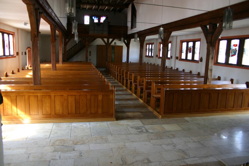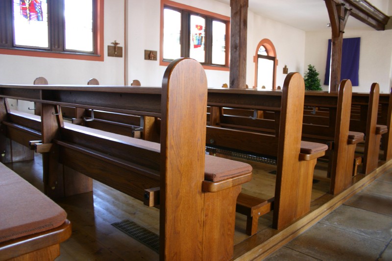 Bänke in Eiche massiv, Sitzfläche massiv mit aufgelegten Polstern.