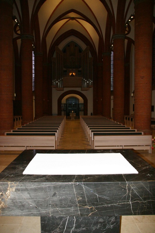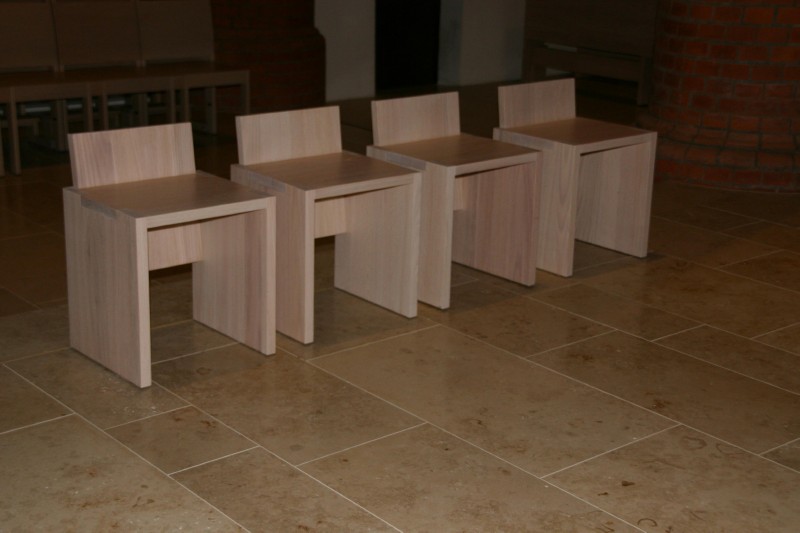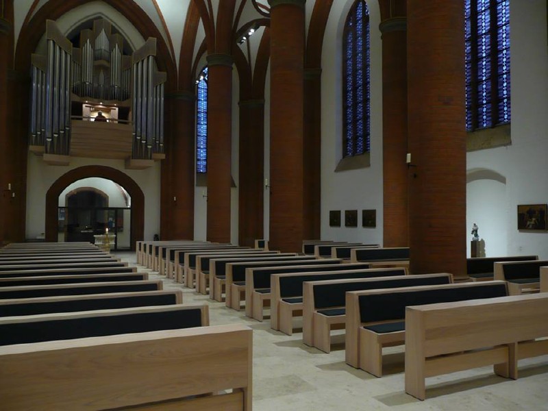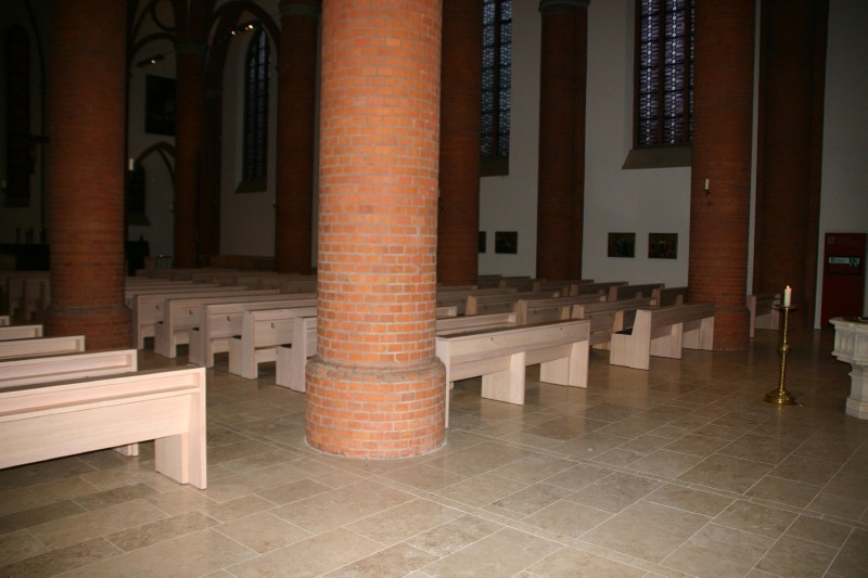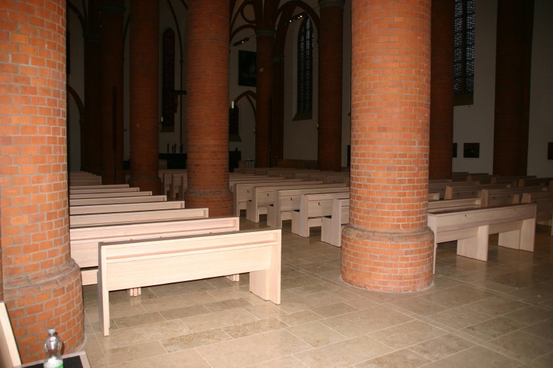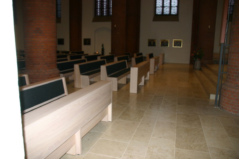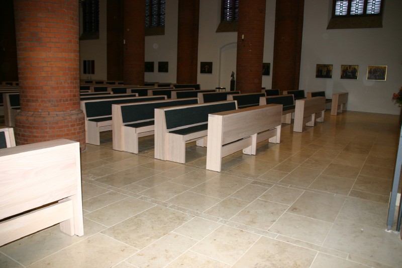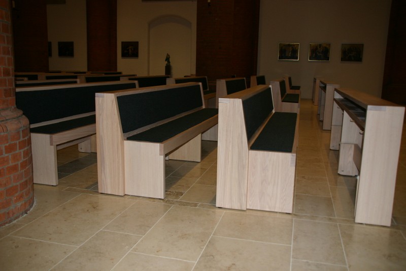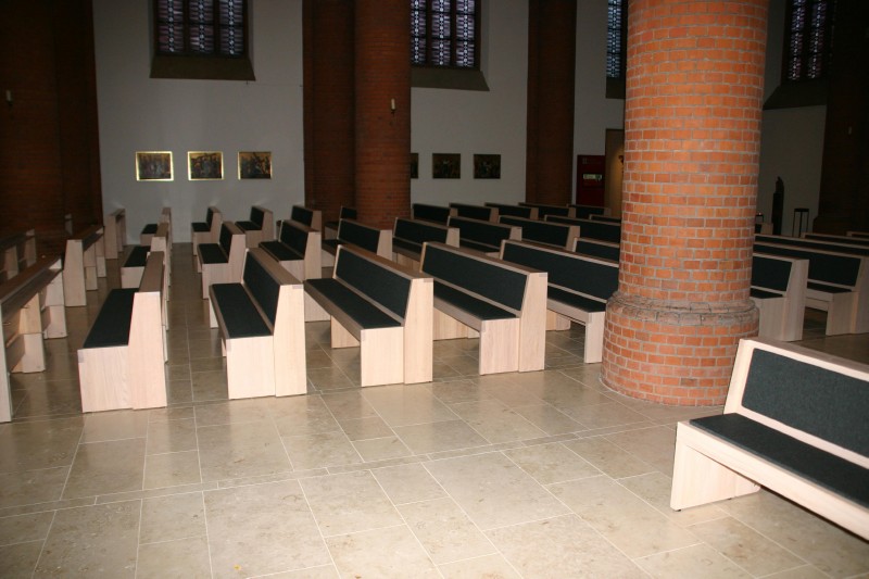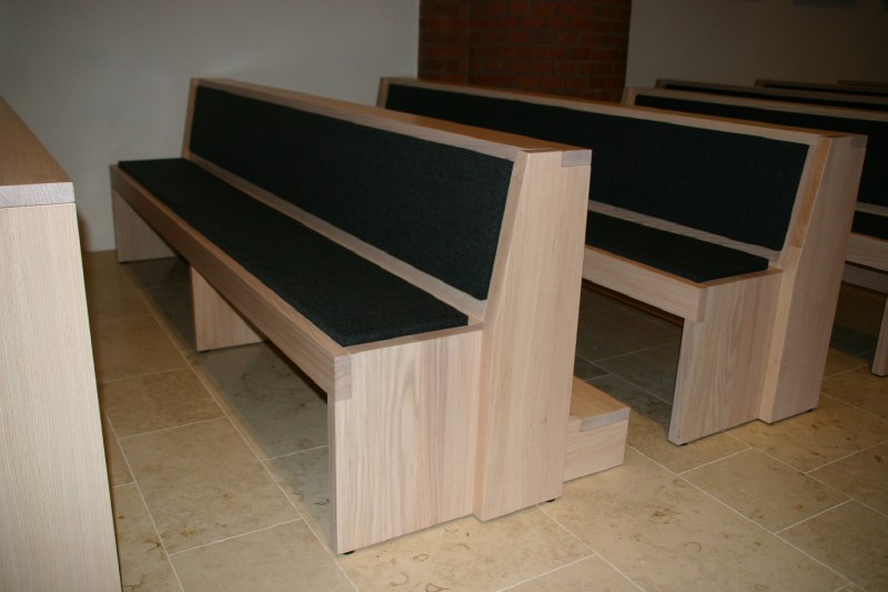Kirchenbänke in Eiche, gebeizt, Sitzfläche und Rückenlehne gepolstert.