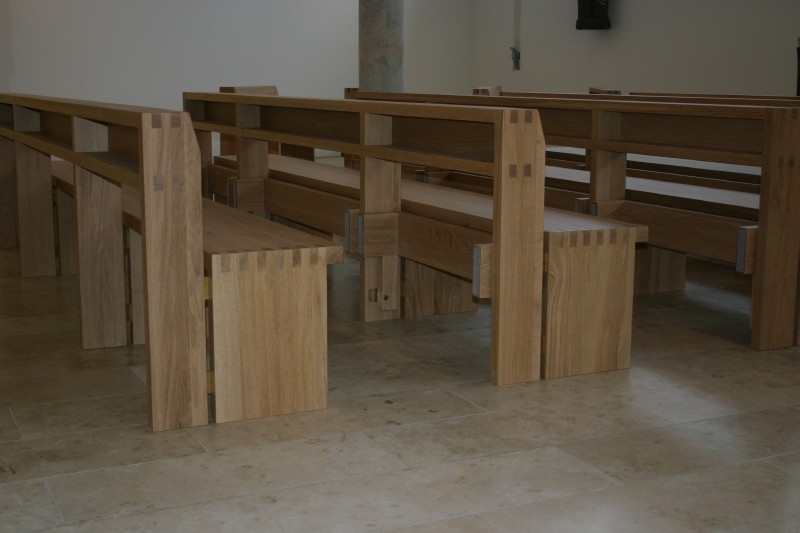 Bänke in Eiche massiv, Eckverbindungen mit Fingerzinken. Kniebrett klappbar mit Gewichtsausgleich.