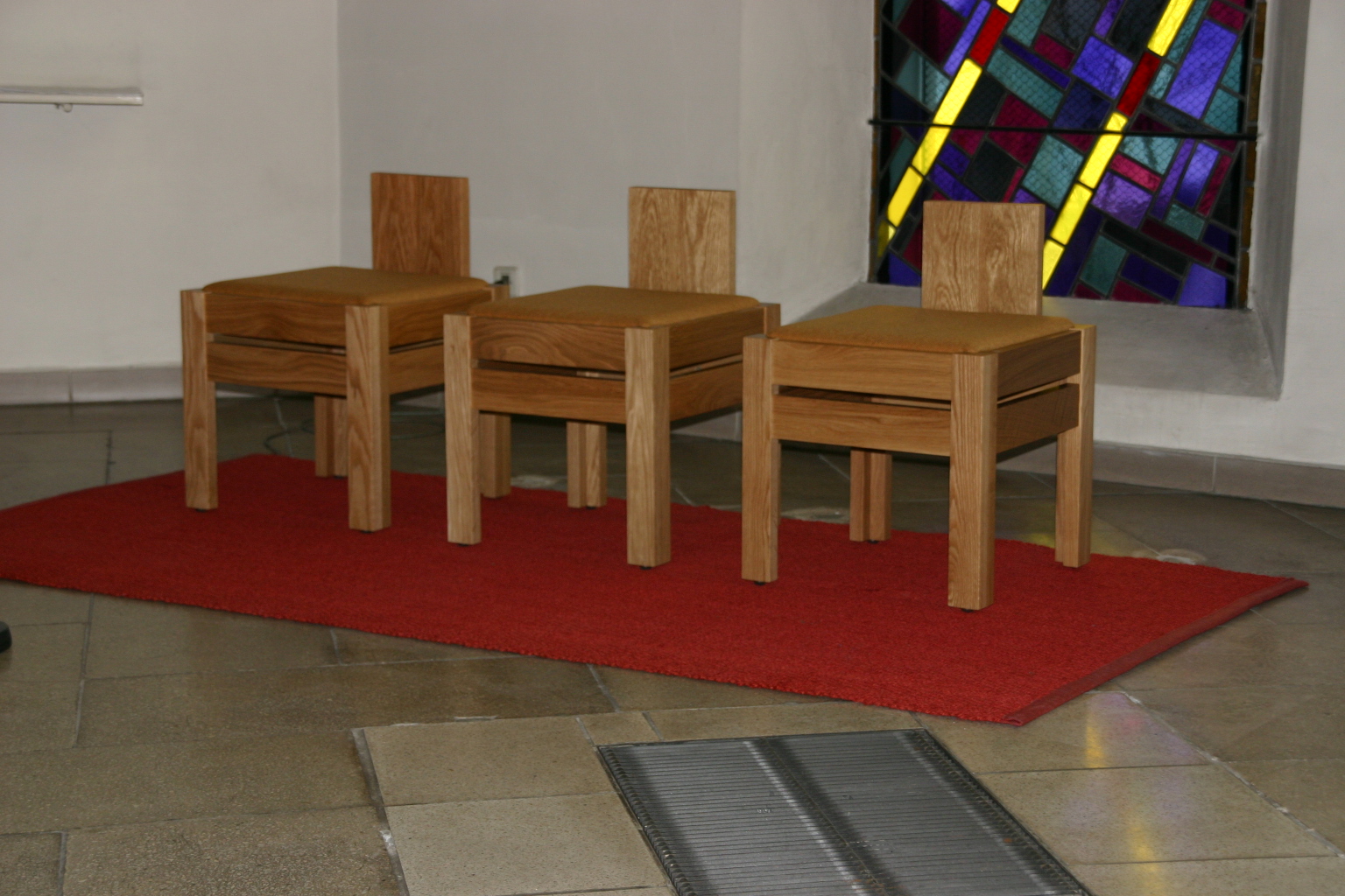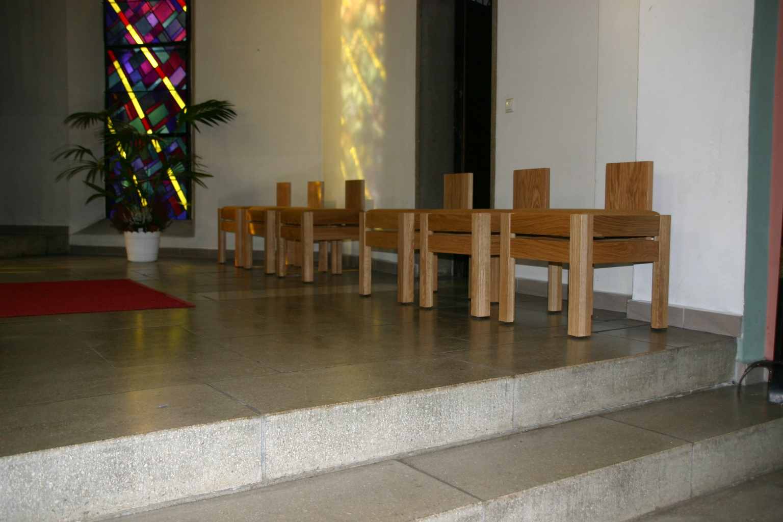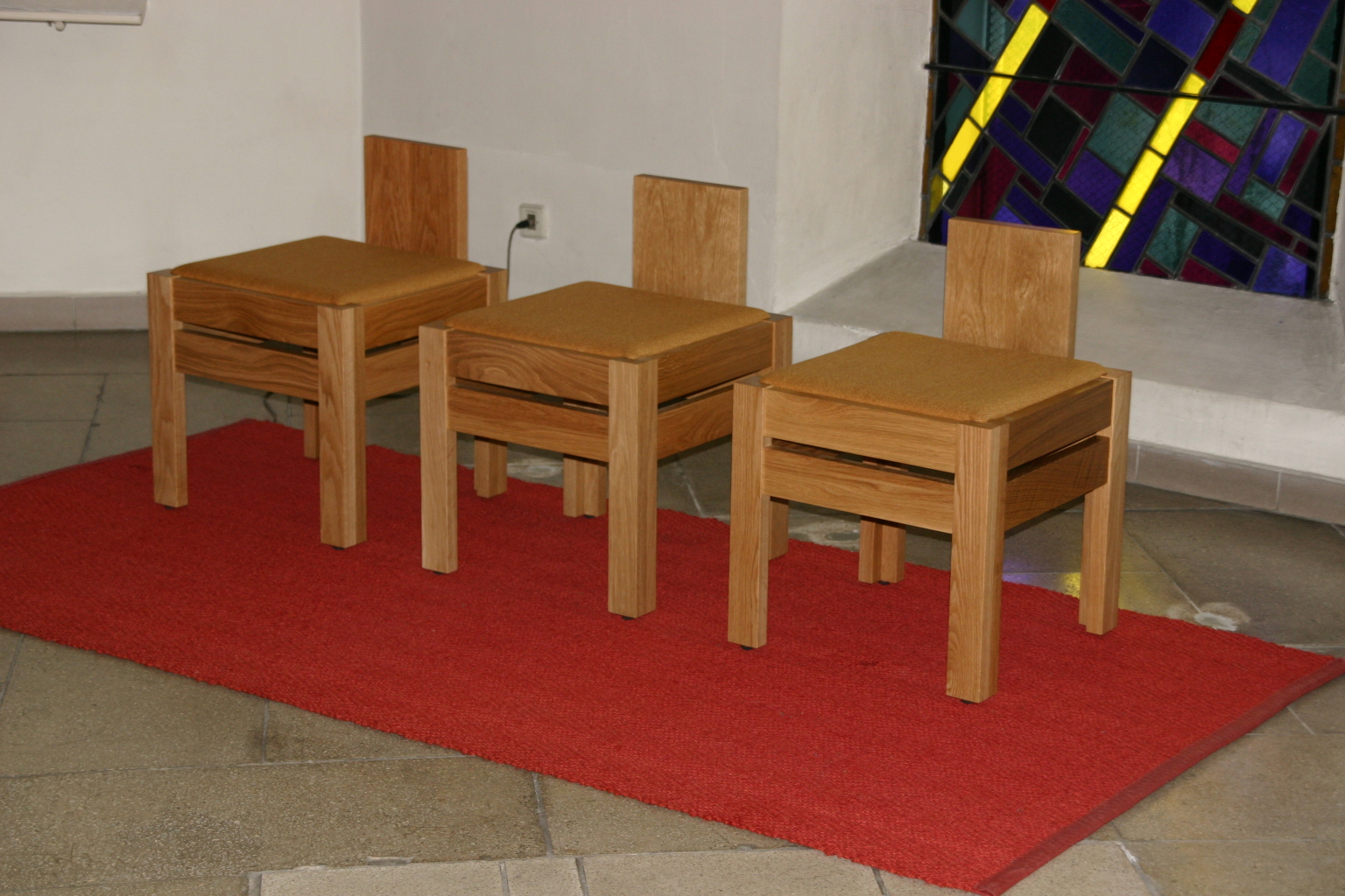 Sedilien hier in Holzart Eiche mit gepolstertem Sitz und Rückenstütze.