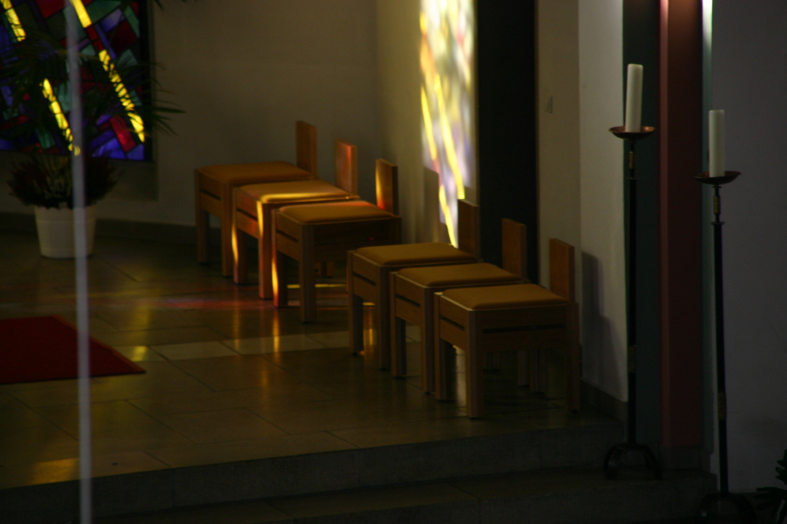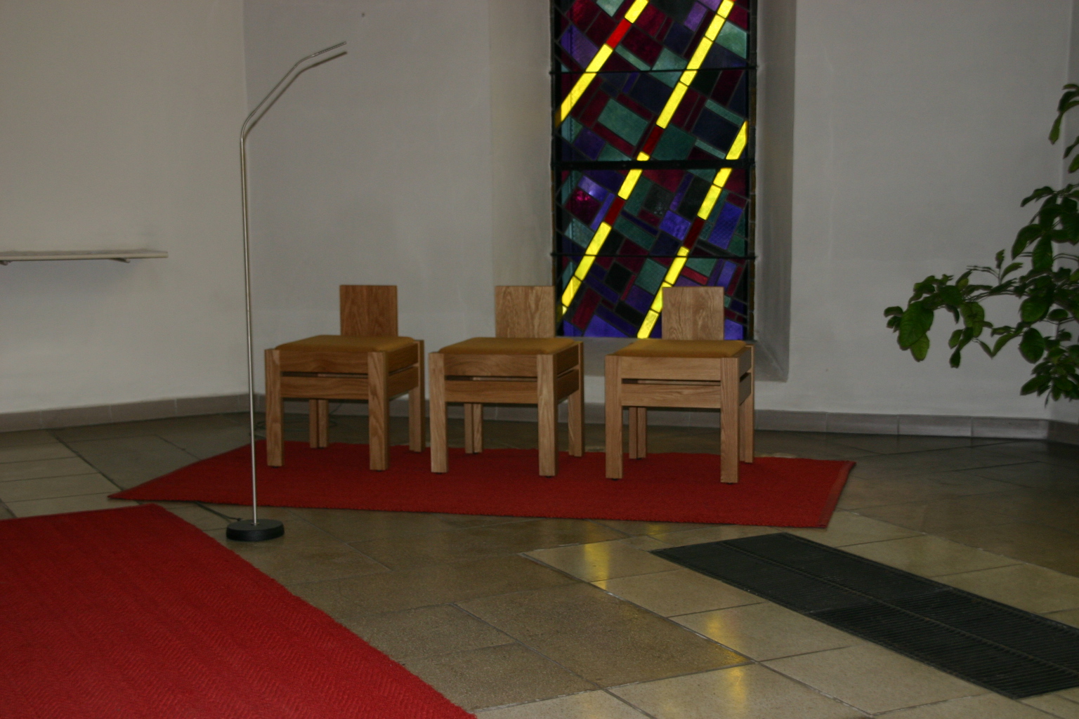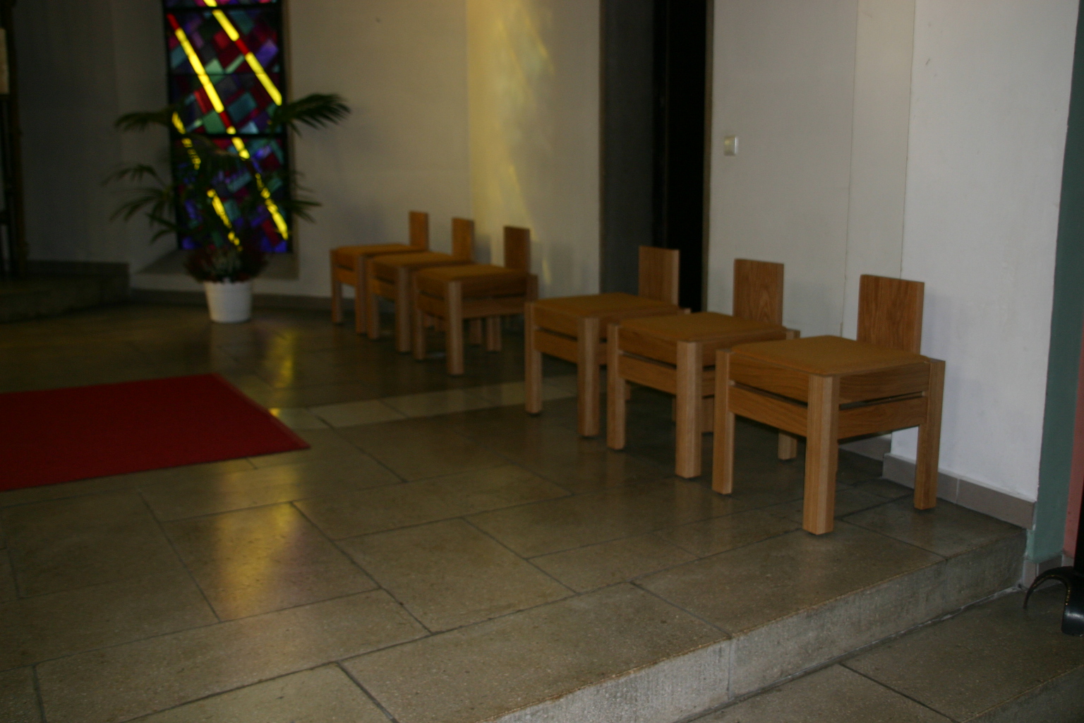 Sedilien hier in Holzart Eiche mit gepolstertem Sitz und Rückenstütze.
