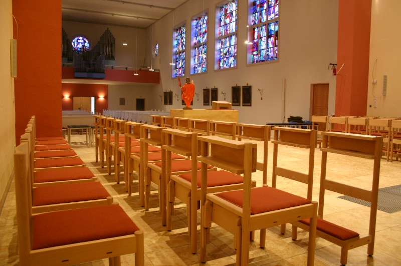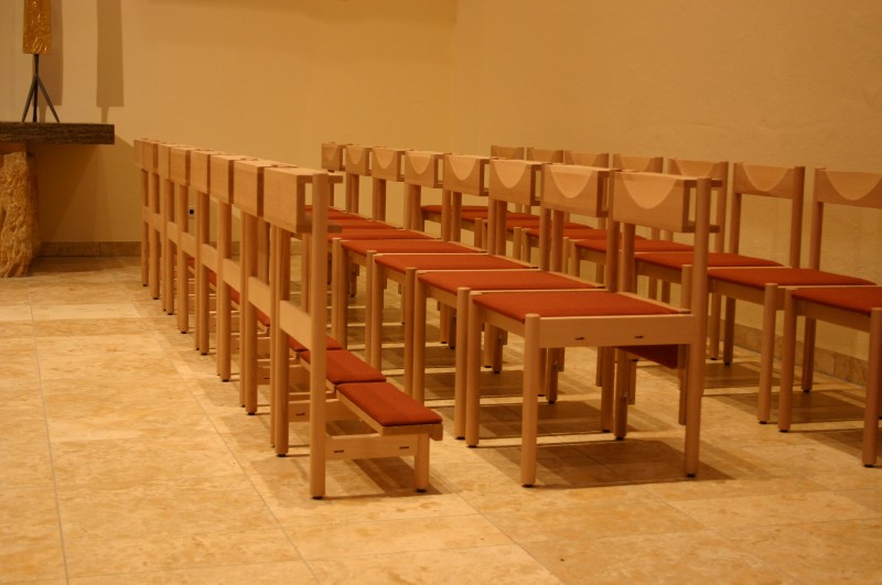 Altarraumbestuhlung mit unserem Modell OCTO in Buche. Kniebrett klappbar, Frontelemente mit festem Kniebrett.