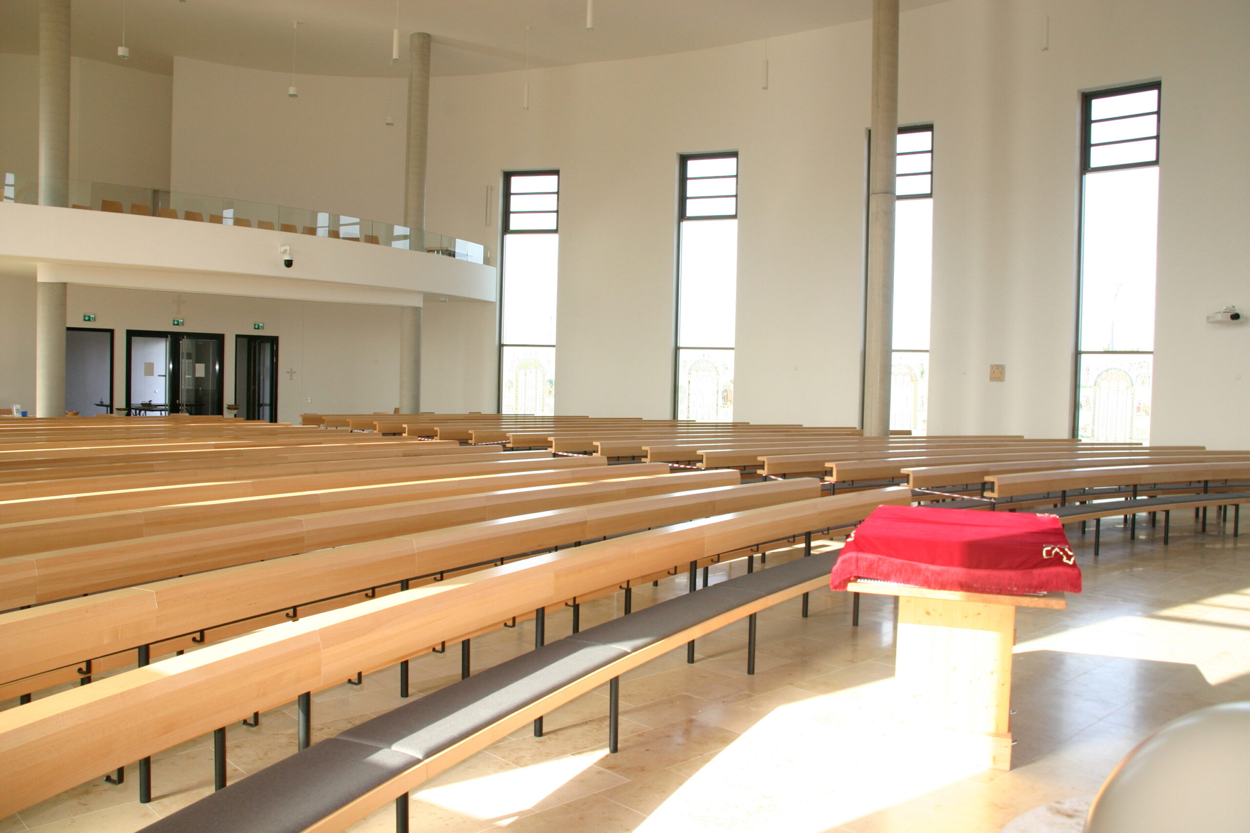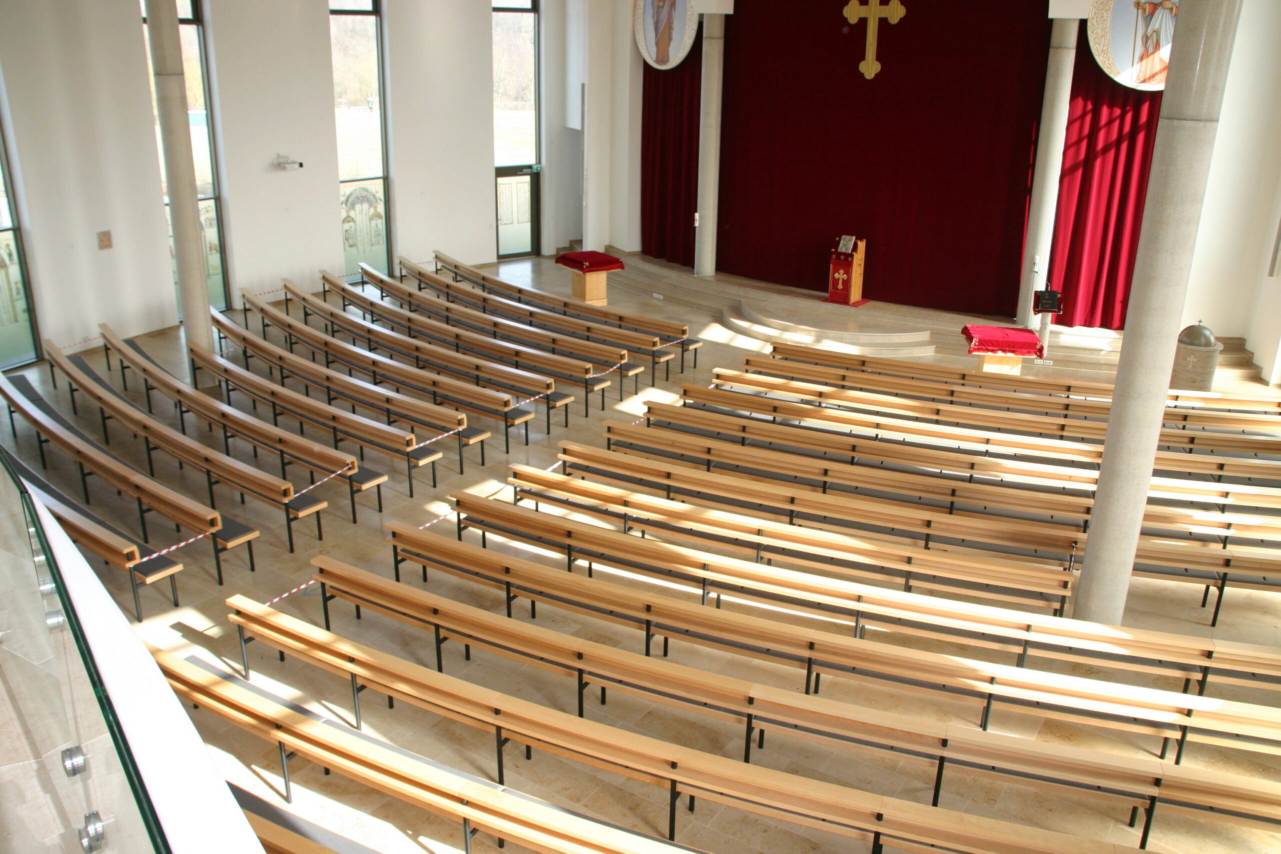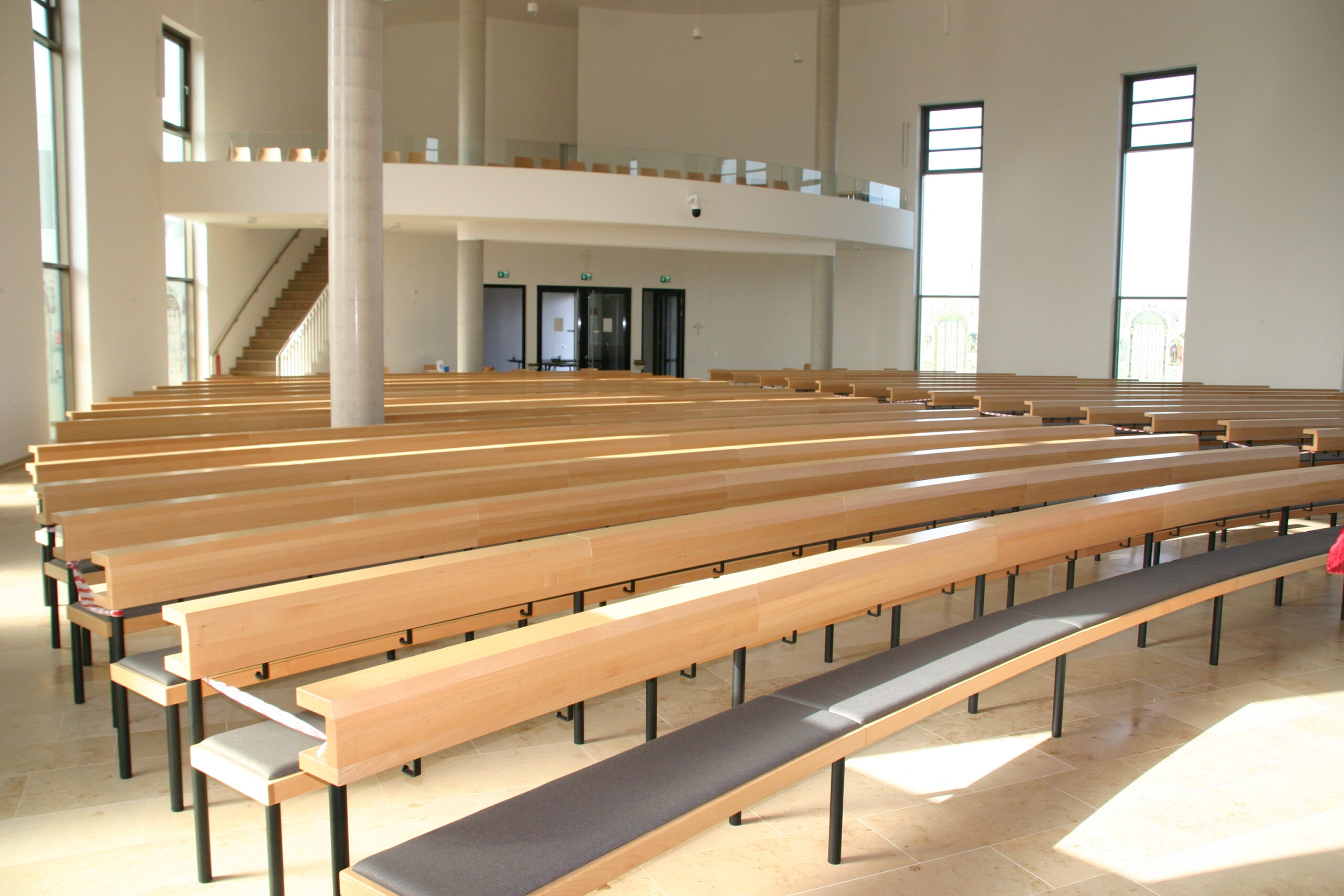 Rundbänke RBS in leicht gedämpfter Buche, Sitz gepolstert, Gestelle aus Rundstahlror, pulverebschichtet. Außerdem Lieferung der losen Bestuhlung für die Empore und für den Gemeindesaal.