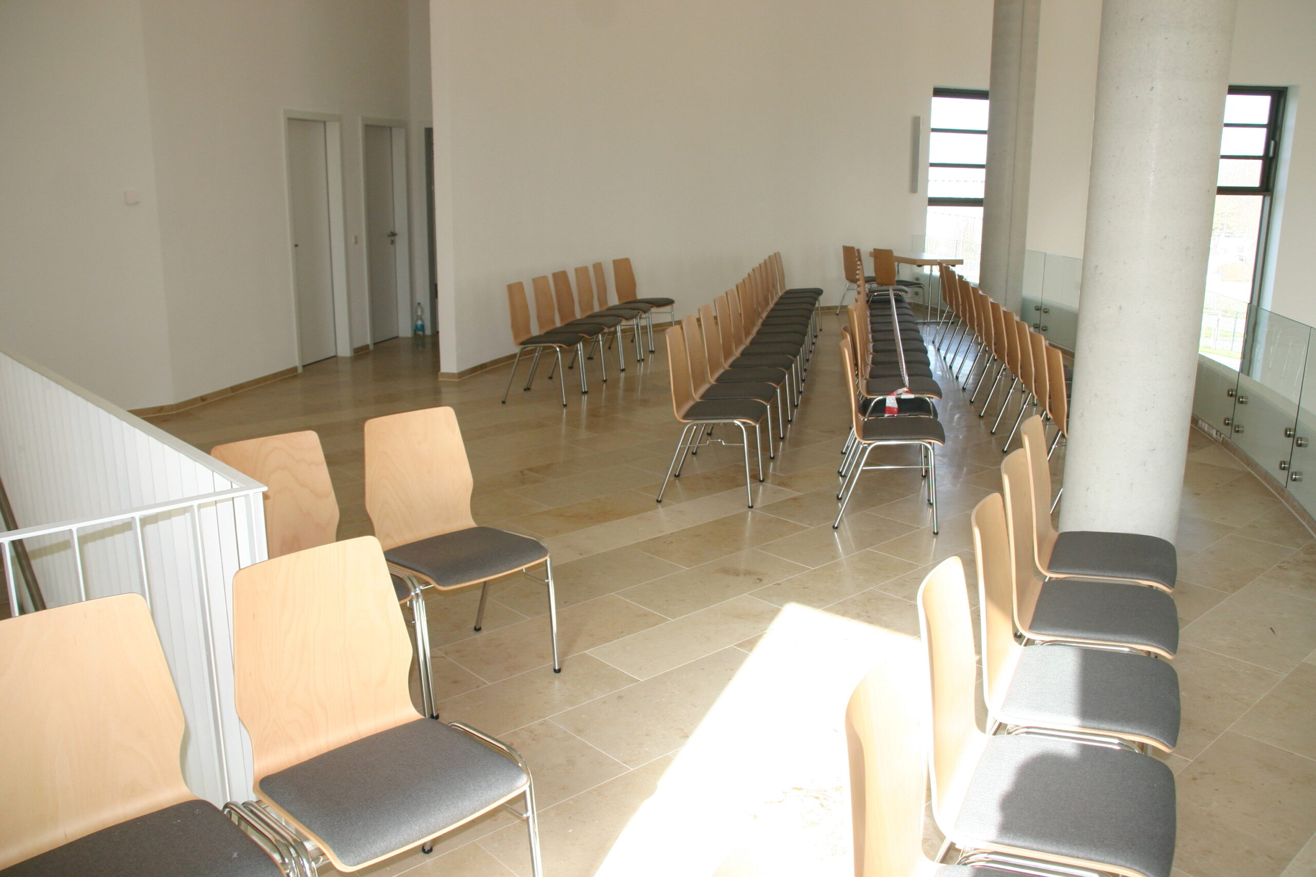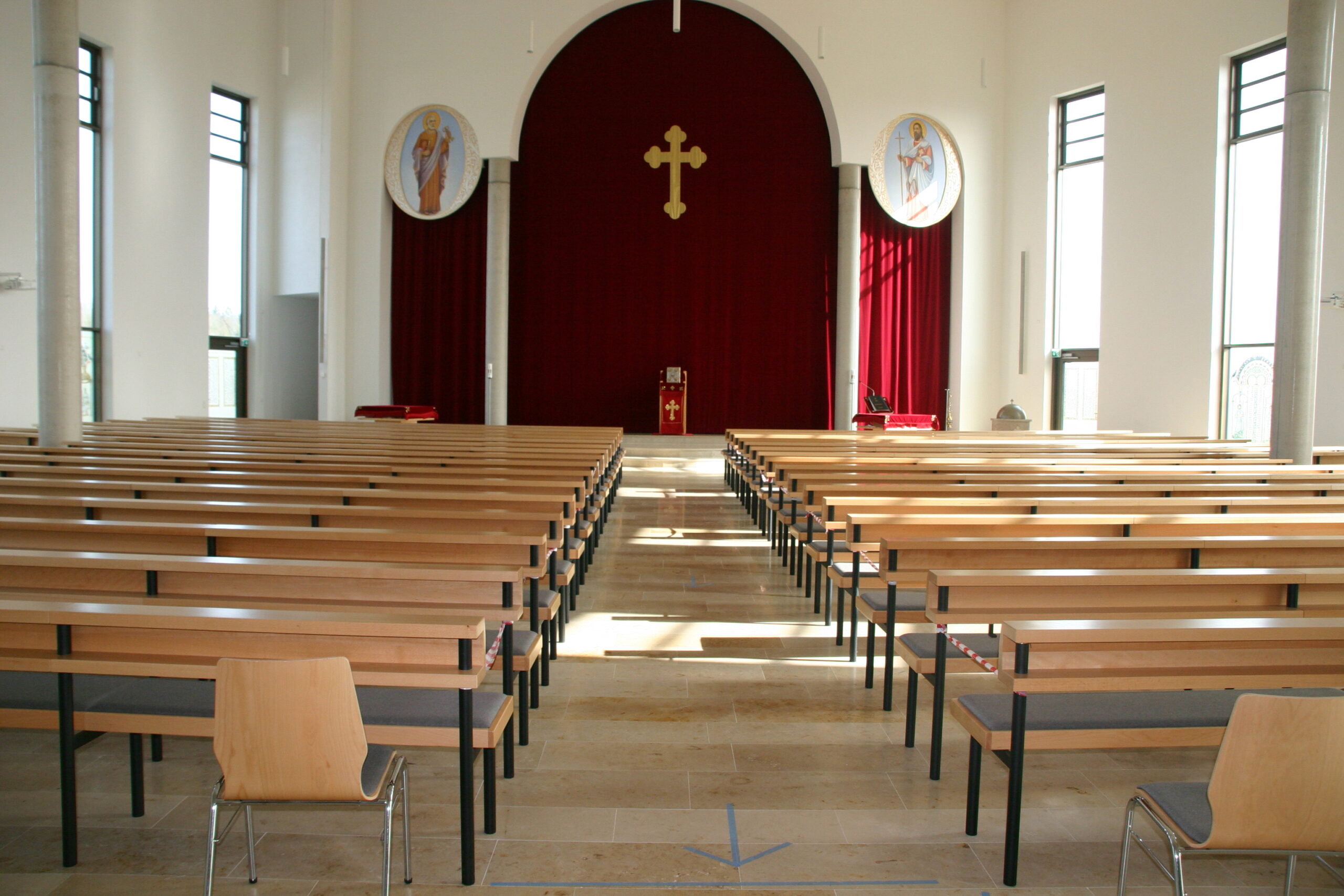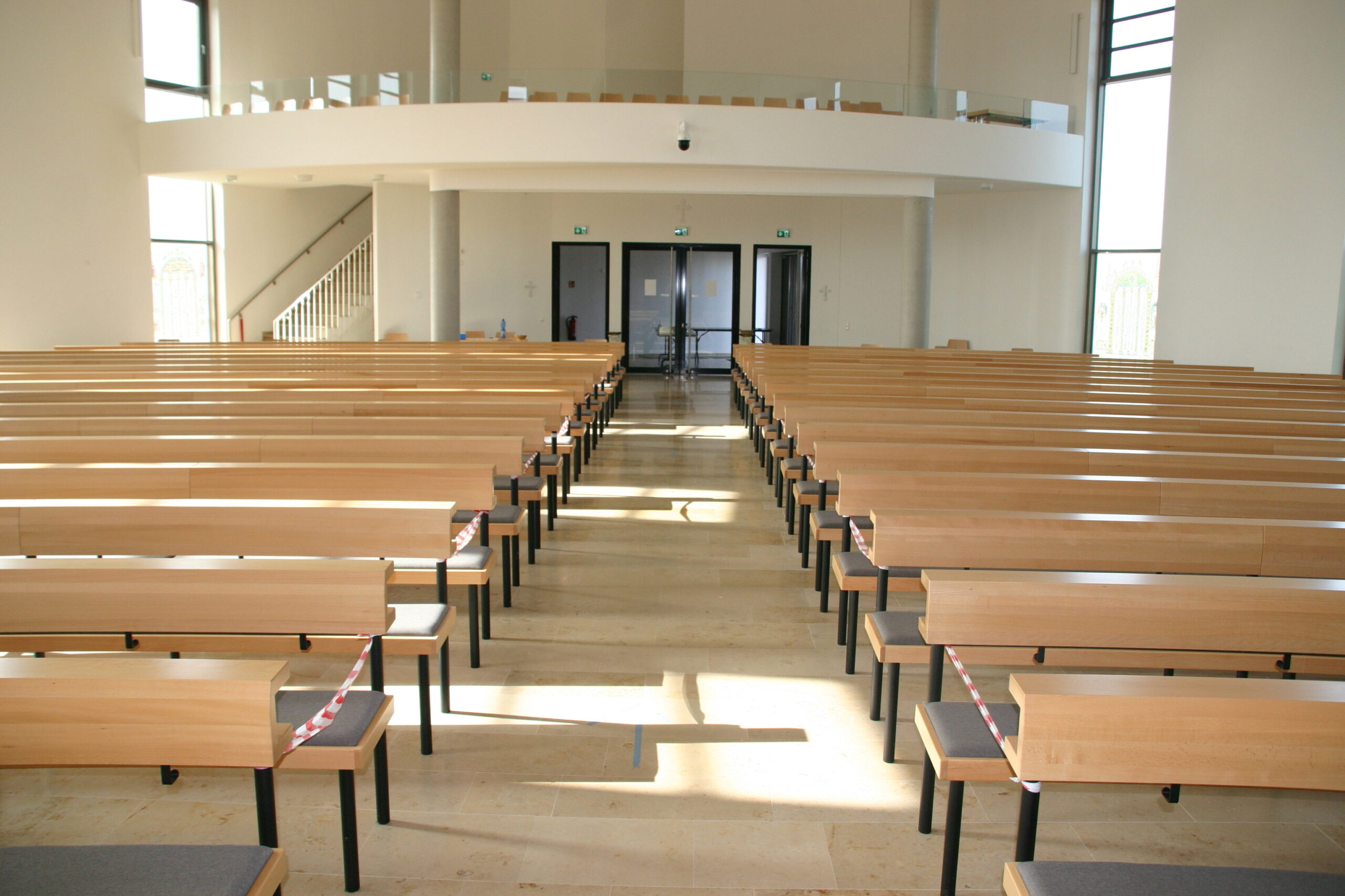 Rundbänke RBS in leicht gedämpfter Buche, Sitz gepolstert, Gestelle aus Rundstahlror, pulverebschichtet. Außerdem Lieferung der losen Bestuhlung für die Empore und für den Gemeindesaal.