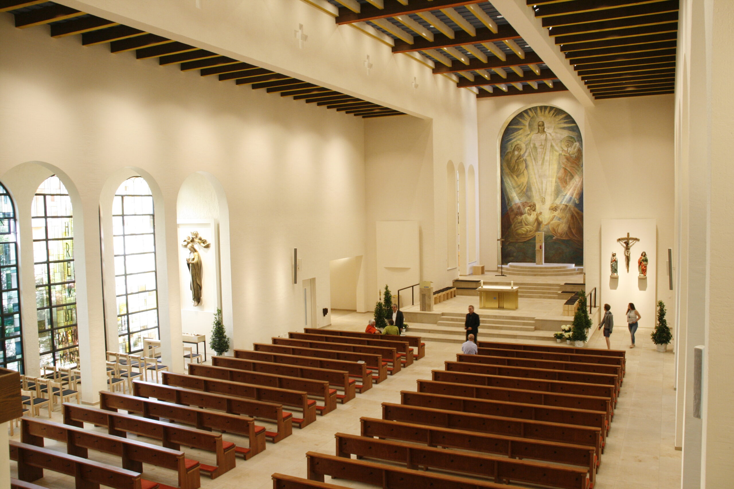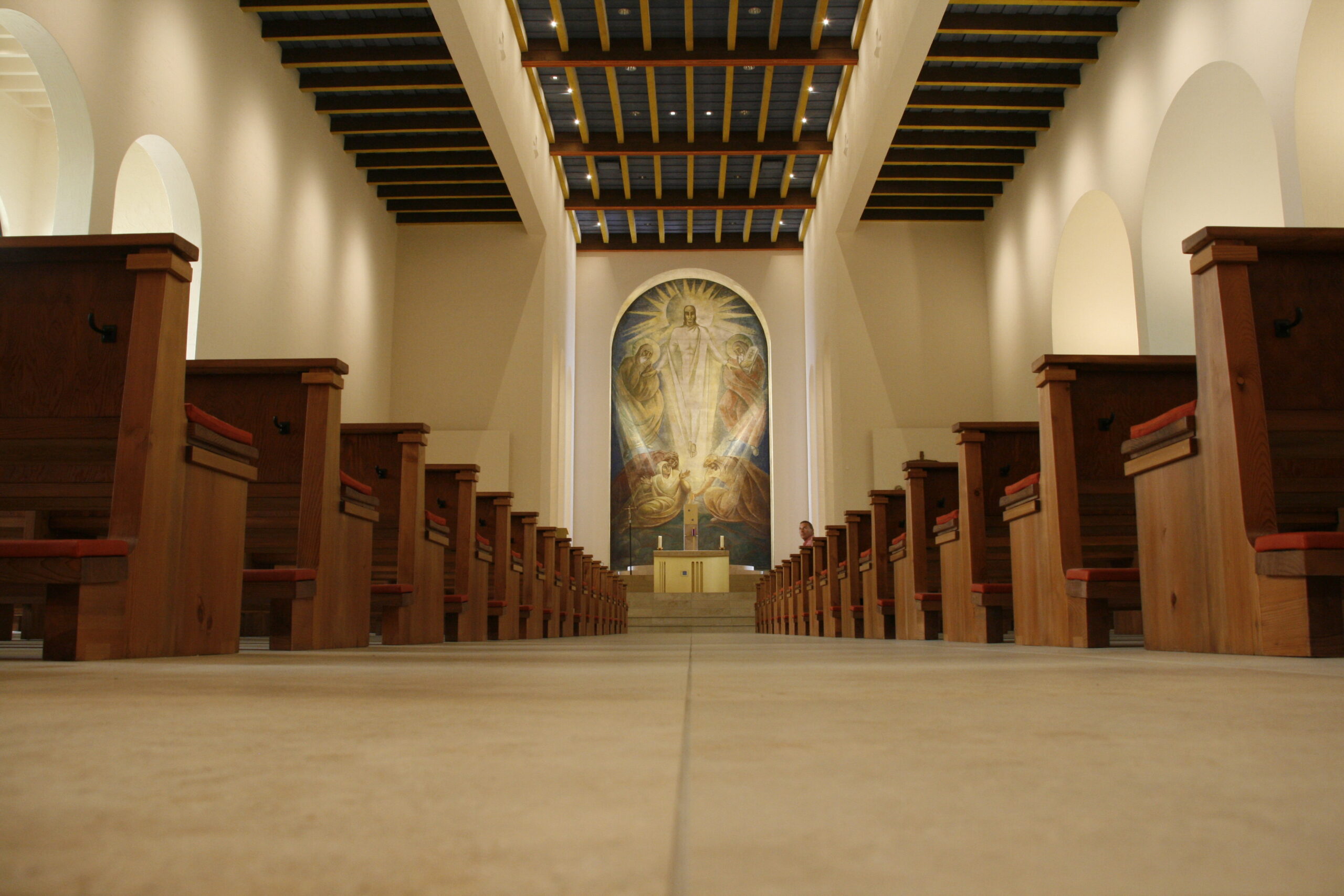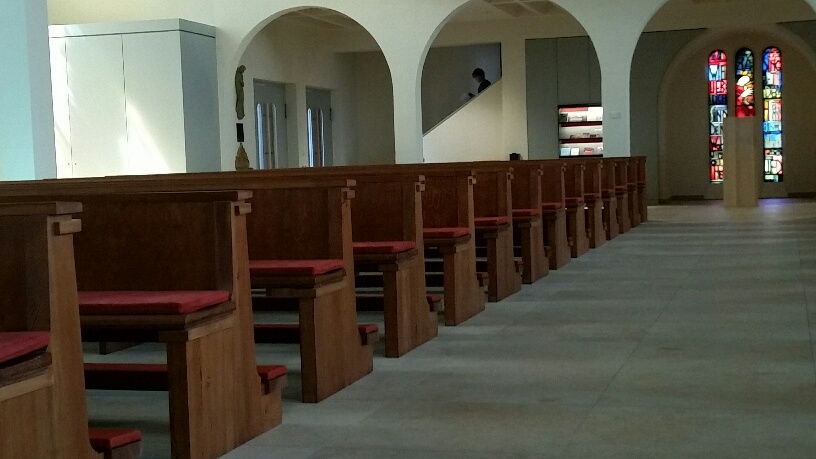 Überarbeitung der denkmalgeschützen Kirchenbänke in der von Architekt Linder in den 30iger Jahren erbauten Taborkirche. Fotos Spaett Architekten Konstanz. Lieferung der Kirchenstühle und Sedilien, sowie der Sitz- und Kniepolster.