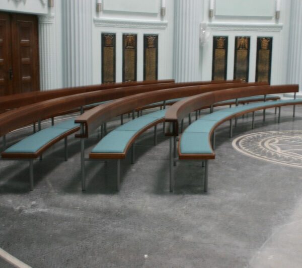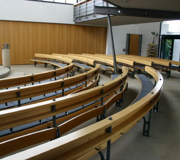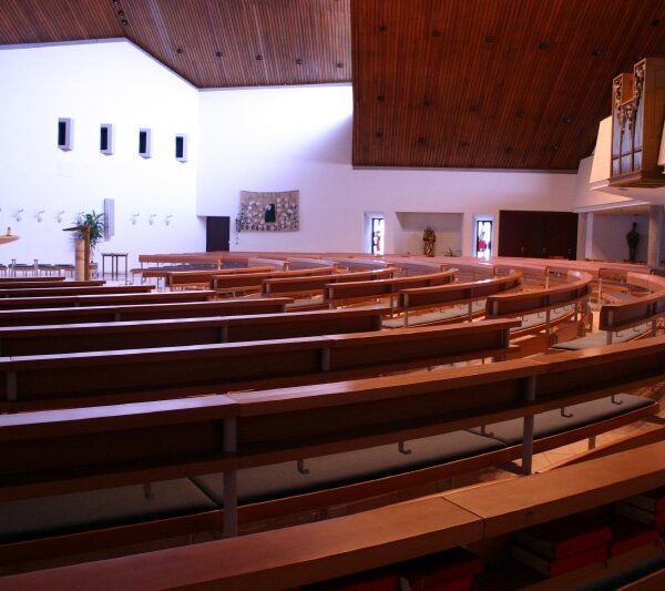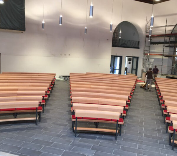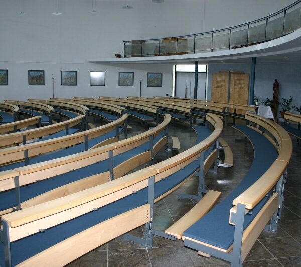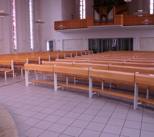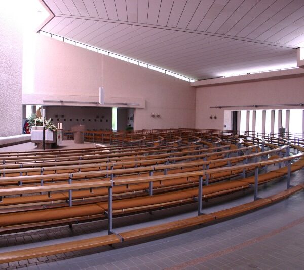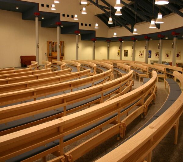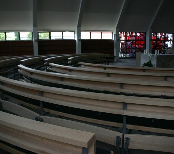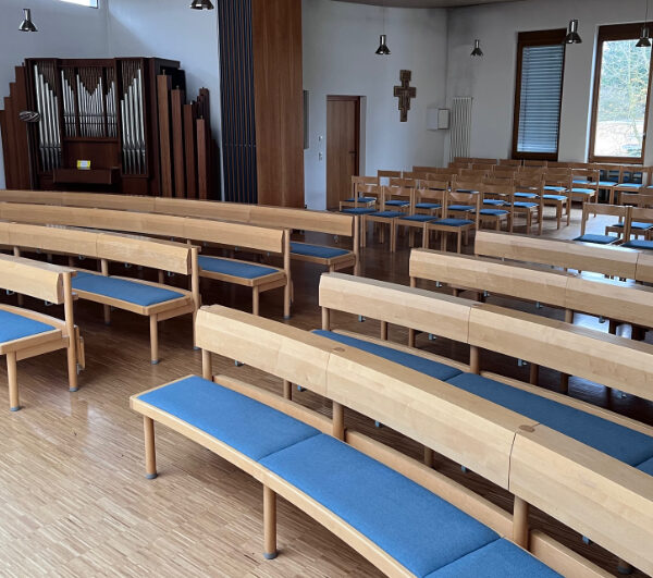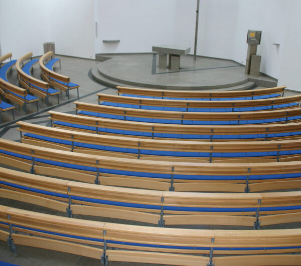 das sich die Gemeinde versammeln kann und sie zur Trägerin der Liturgie macht. Um die optische Mitte des Altars im Kirchenraum zu gewährleisten, ist eine runde Anordnung der Bänke eine ideale Lösung. Unser Rundbanksystem ist prädestiniert, diesem Anspruch gerecht zu werden. Vielfältige Grundrissvariationen sind einfach zu realisieren.